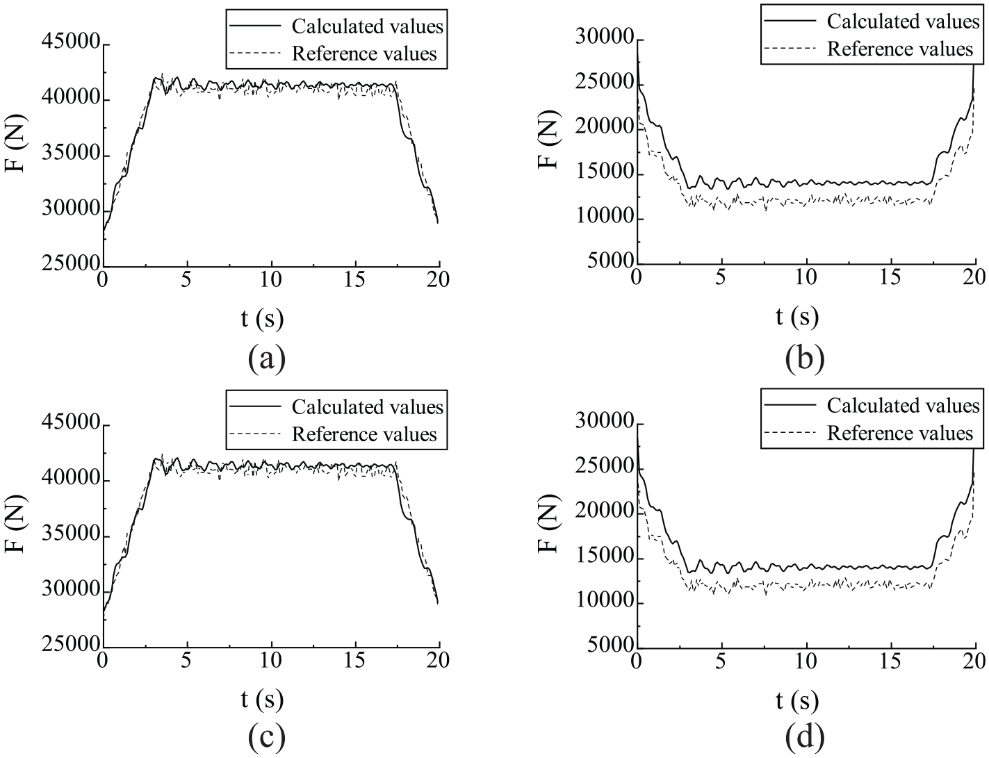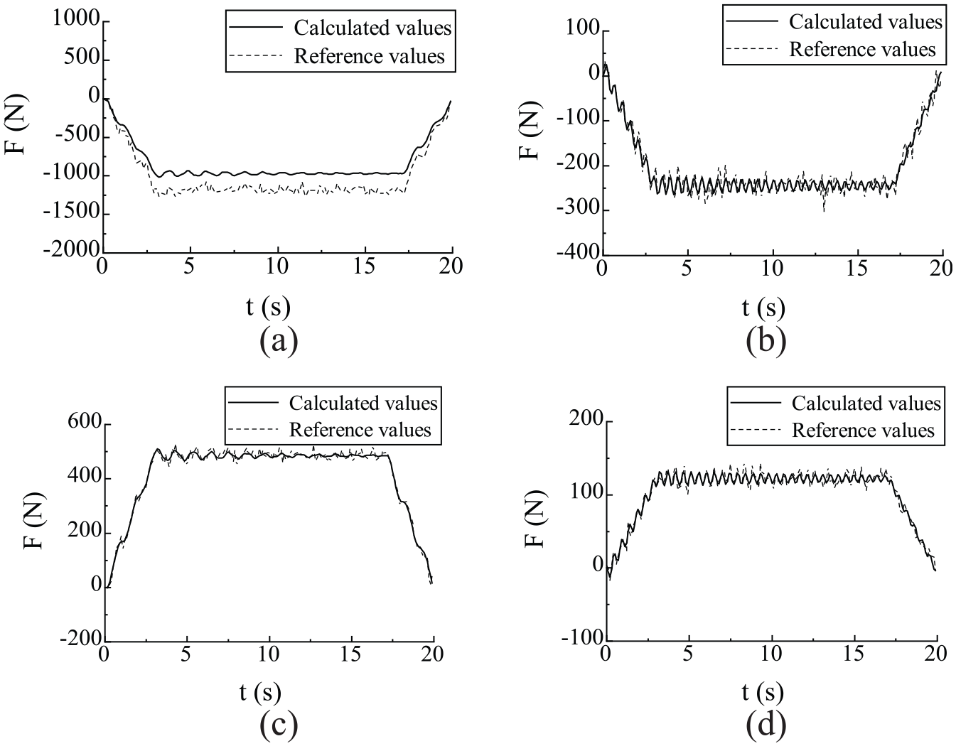 Radial force of the running wheel tire: (a) left front wheel, (b) right front wheel, (c) left rear wheel, and (d) right rear wheel.