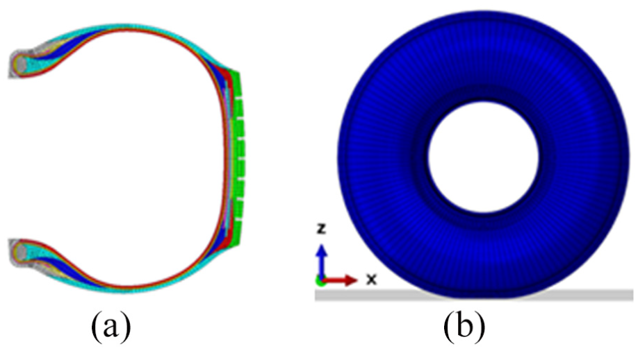 Finite element model of running wheel tire: (a) two-dimensional model and (b) three-dimensional model.