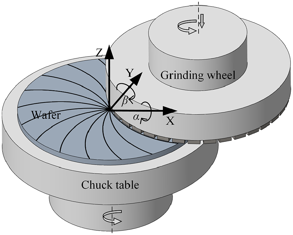 Oh and Lee 1 experimentally studied the relationship between different reference plane-site, front least square focal plane range (SFQR) and site back ideal focal plane range (SBIR), and TTV of a wafer. They concluded that the TTV was associated with SBIR, but not with SFQR. Chidambaram et al.2,3 and Gao et al. 4 established the mathematical model of the dressing shape of the chuck. The model could attain the shape contour of the chuck according to the set parameters. The simulation outcomes of the model were compared with the experimental outcomes to verify the correctness of the model. Sun et al.5–8 developed the model of grinding marks of a single grain and the mathematical model of the grinding shape of the wafer. Then the adjustment of the wafer surface shape, the impact of the shape of chuck on the grinding marks, and generation mechanisms of central bumps on ground wafers were studied. Chen and Hsu 9 established the mathematical model of the surface profile of chuck, the surface profile of ground wafer, and TTV in BG. They also studied the effect of the angles of the grinding wheel on the shape of chuck and wafer. Afterward, they verified the acquired rule through experiments. Zhou et al. 10 considered the influence of the machine stiffness and the density of grinding marks on the wafer shape, and established the mathematical model of wafer shape. According to the machine stiffness and process parameters, the model could be used to compute the optimal spindle inclination angle of the grinding wheel. Huo et al.11,12 obtained wafers with high surface flatness and low surface damage by using nano-grinding, analyzed the causes and influencing factors of grinding marks in ultra-precision grinding of wafers, and then put forward some measures to suppress the grinding marks.