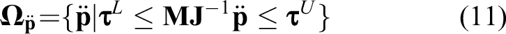 Here, the acceleration polytope in the output space is also constructed using the similar method. It is assumed that the end-effector payload is determinate when computing the end-effector accelerations. To determine the acceleration feasible region in task space corresponding to the joint actuated torque limits and the joint velocity limits, equation (4) is rearranged as
