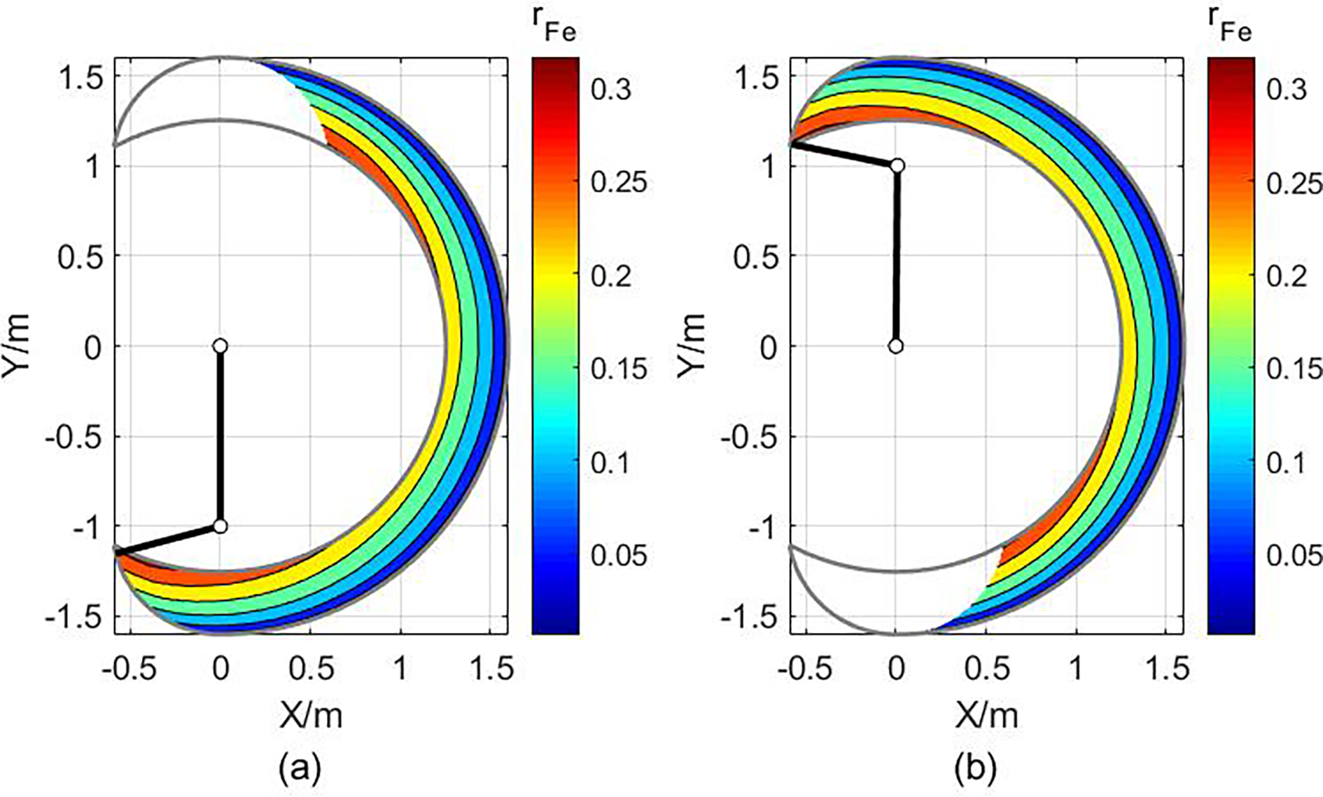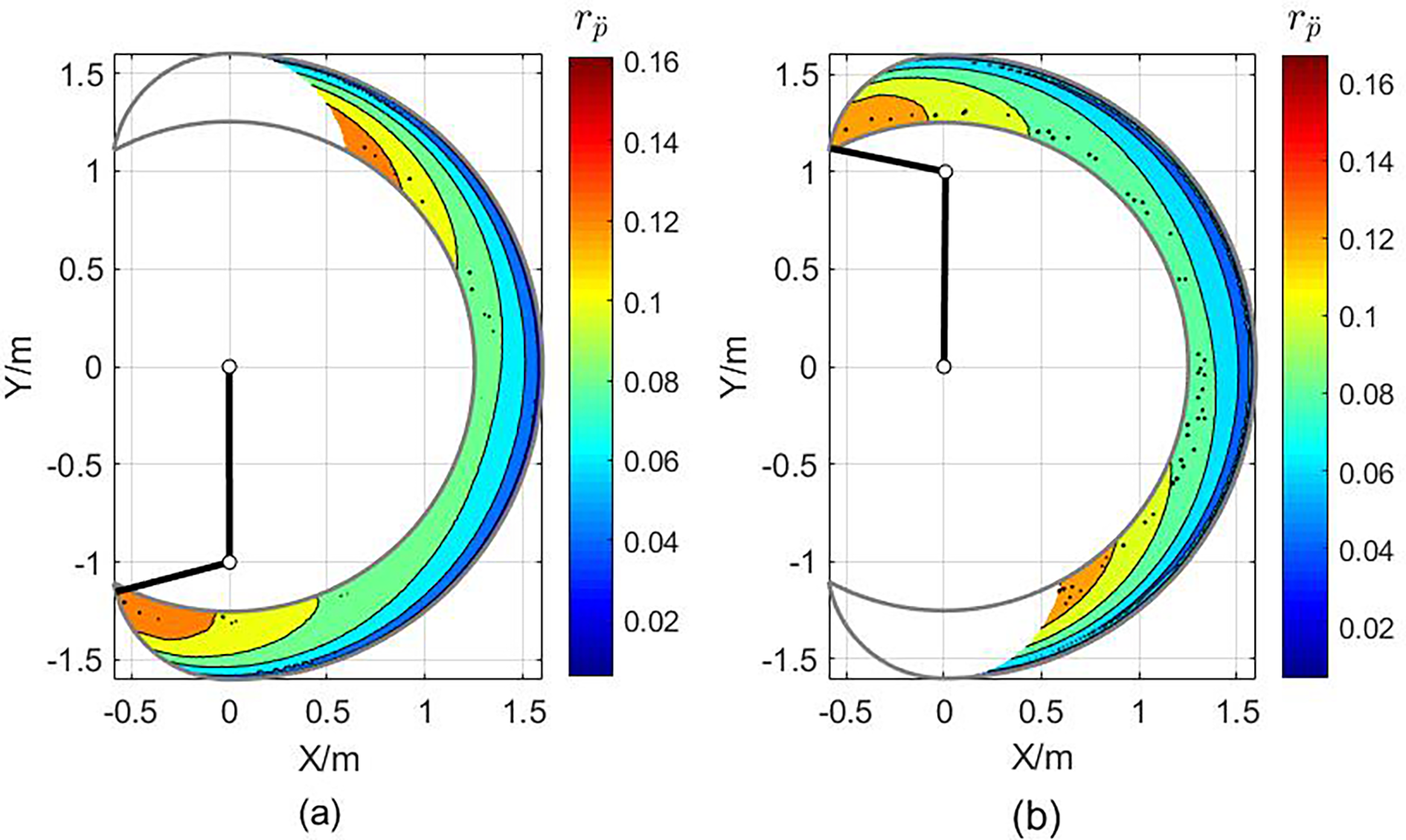 Comparison of the directional uniformity measure spectrum plots obtained by discretizing joint space and end-effector workspace is given in Figure 17. Figure 17(a) is the filled contour plot created by interpolating the 3D scattered data containing the directional uniformity measure values on the working points shown in Figure 15(a). Figure 17(b) is directly created based on the directional uniformity measure values on the working points shown in Figure 15(b). As mentioned previously, in Figure 15(a), the working points and manipulator postures satisfy a one-to-one correspondence, while in Figure 15(b) a one-to-many correspondence is satisfied. Therefore, Figure 17(a) is the interpolated results of the directional uniformity measures of the sampled manipulator postures, while Figure 17(b) is filled by the average value of the directional uniformity measures of all the manipulator postures corresponding to every working point. Obviously, two results show a radial distribution pattern except that Figure 17(b) has more clearer and neater contour lines than Figure 17(a).