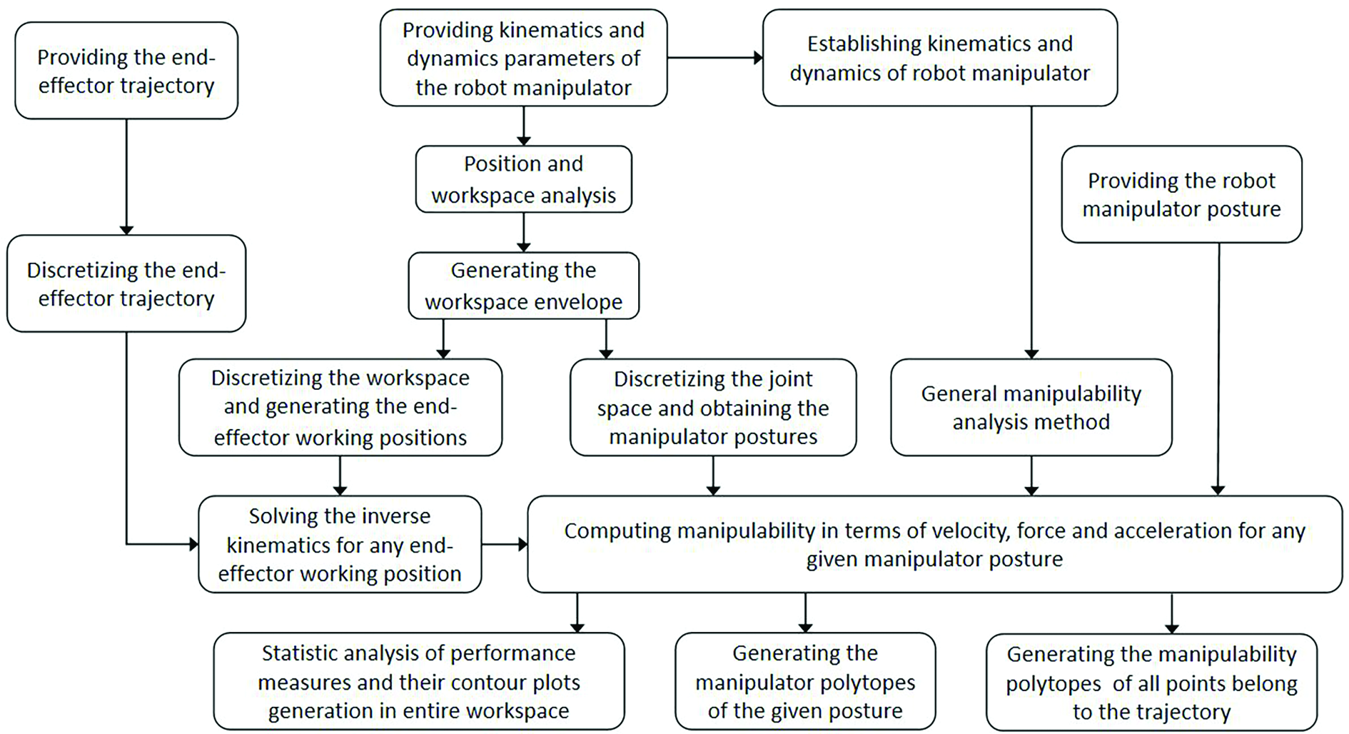 Based on our proposed general performance analysis method, an overall architecture applicable to manipulability assessment for any given posture, practical or simulated end-effector operating trajectories, and entire workspace of a robot manipulator is established, as shown in Figure 3.