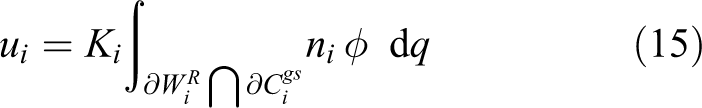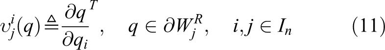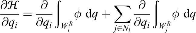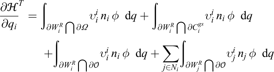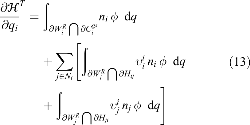 Considering the second summation term, infinitesimal motion of qi may only affect at , where is the neutral region defined in remark 2, since both hyperbola branches are affected by alteration of one of the foci. In addition, only the AWGV neighbors (equation (8)) of the ith agent are considered in the summation, as a major property of AWGV-partitioning. Therefore, the former expression can be written via the generalized Leibniz integral rule31 (by converting surface integrals to line ones) as