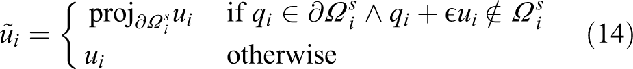 Using the subset , instead of constraining the whole positioning uncertainty regions inside Ω, we need only constrain their centers qi inside the respective regions . This can be achieved by projecting the velocity control input ui of each agent on , resulting in movement along the region’s boundary. This control extension is only required if and the control input ui leads agent i towards the outside of . As a result, the control law extension that guarantees agents remain inside the region is
