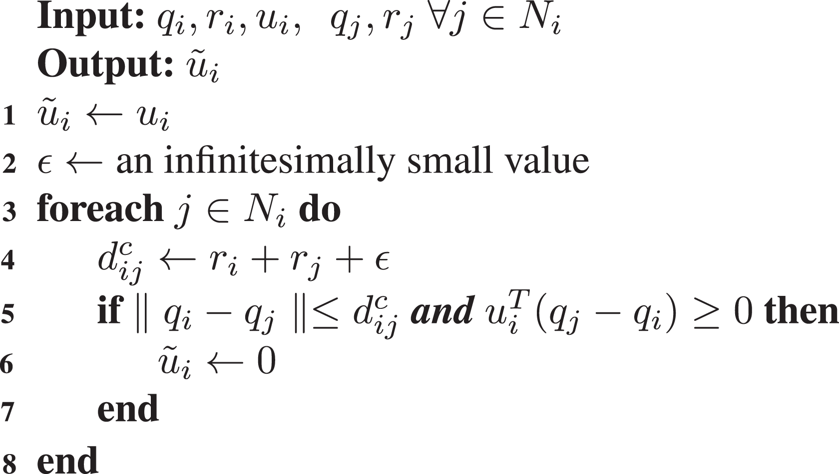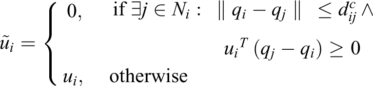 Although the derived control scheme guarantees monotonic increase of the coverage objective function , it cannot guarantee collision avoidance between the agents, since it can result in the overlapping of two or more positioning uncertainty regions. In such a case, it is possible that the agents collide, since their actual positions may reside anywhere within their respective positioning uncertainty regions. In order to avoid overlapping of positioning uncertainty regions, an extension to the control law is devised. Agent i is stopped when the reported distance between itself and some other agent j becomes less than or equal to a critical distance , and if the control input leads agent i towards agent j, that is, if . ϵ is an infinitesimally small positive constant used so that the control law extension comes into effect before a possible collision. Consequently, each agent i implements