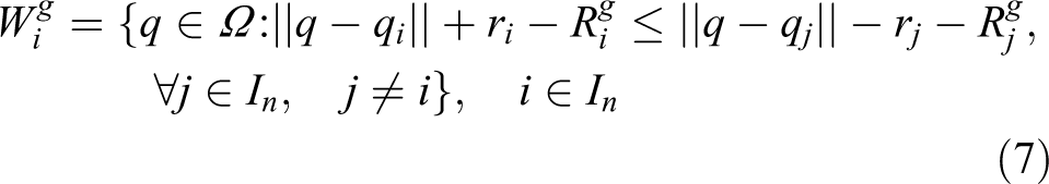The AWGV diagram is a generalization of the GV diagram in which each uncertain region is assigned an importance weight, similarly to the Additively Weighted Voronoi diagram.27–30 Uncertain regions with greater weights are assigned larger portions of the region Ω. Using the agents’ guaranteed sensing radii as weights, it is possible to assign them regions of responsibility based on their sensing performance as well as their positioning uncertainty. The AWGV diagram for a set of uncertain regions with weights is defined as