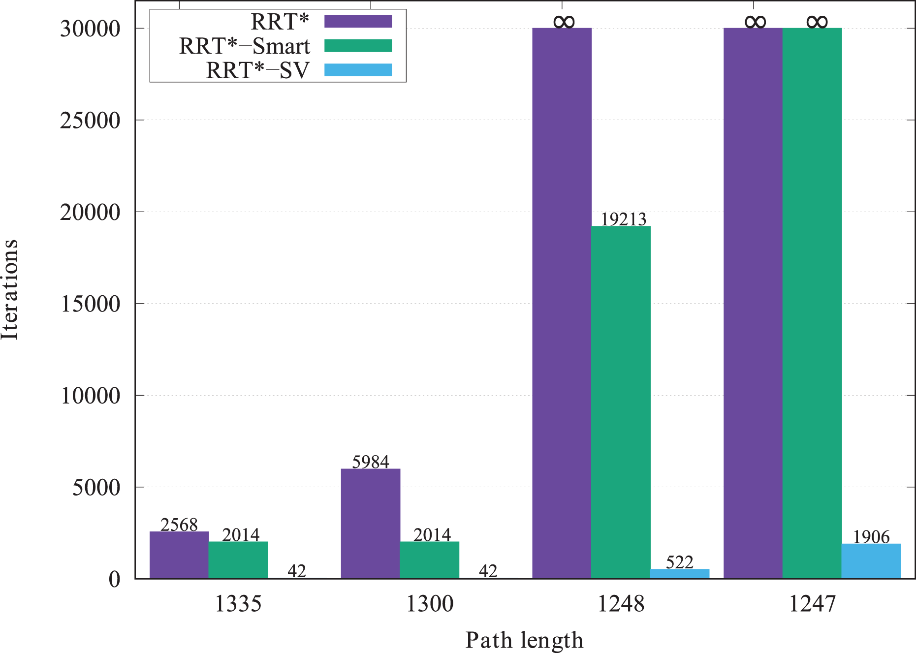 In Figure 11, there is a chart of the average length of the paths planned by each algorithm over 30, 000 iterations. It can be observed that the RRT* and RRT*-Smart could not plan the shortest path, that is, the optimal solution (orange horizontal line), in 30, 000 iterations. On the other hand, the RRT*-SV algorithm has planned the near shortest path close to the iteration 2000.