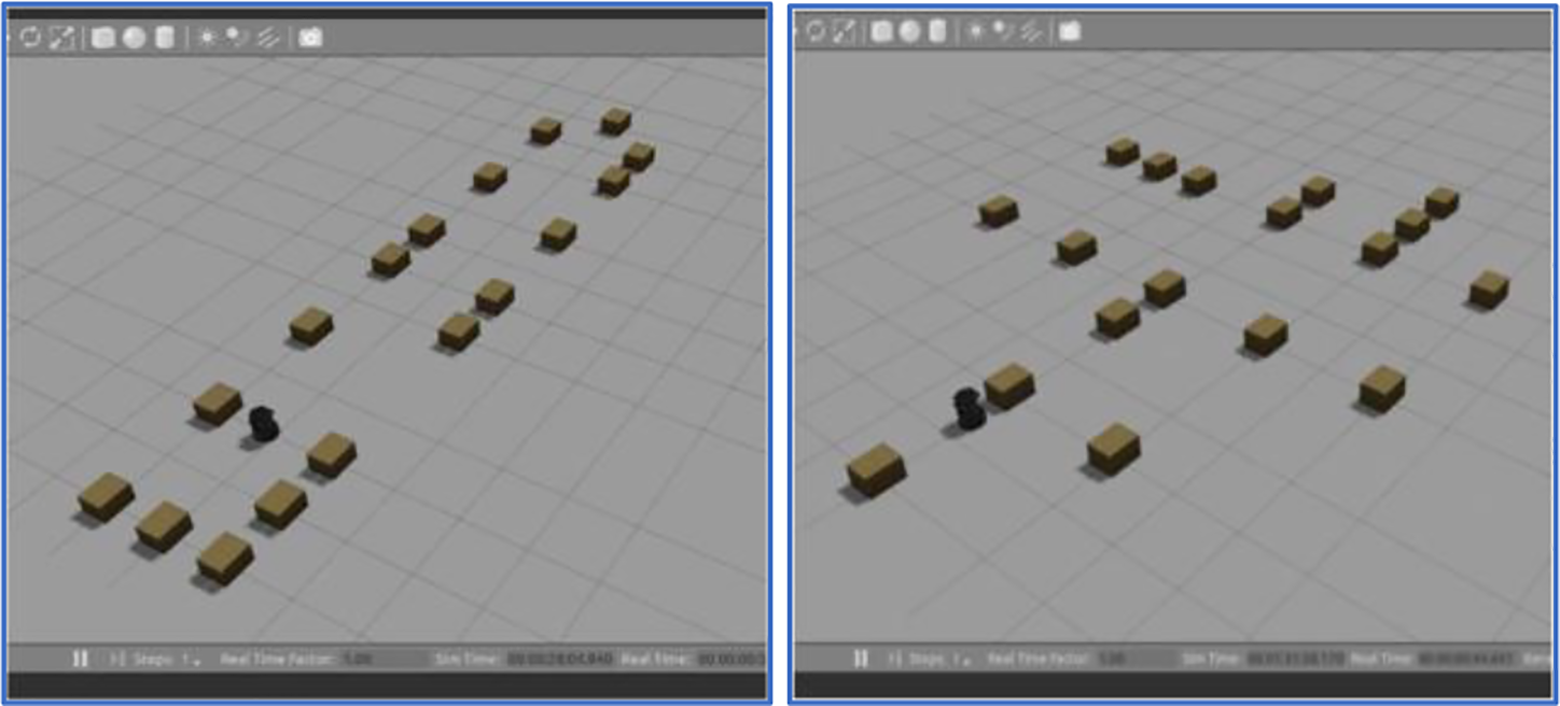 Both simulation and real-world experiments were conducted separately in RECS and JCICS. By utilizing the created world and map, both simulation and real-world experiments were carried out by using two TurtleBots. For each scenario, four different conditions are tested which are Lead TurtleBot sudden stop (LTS), Lead TurtleBot decelerate (LTD), Lead TurtleBot slower speed (LTSS), and straight crossing path (SPD). Simulations and experiments were repeated 10 times for each condition.