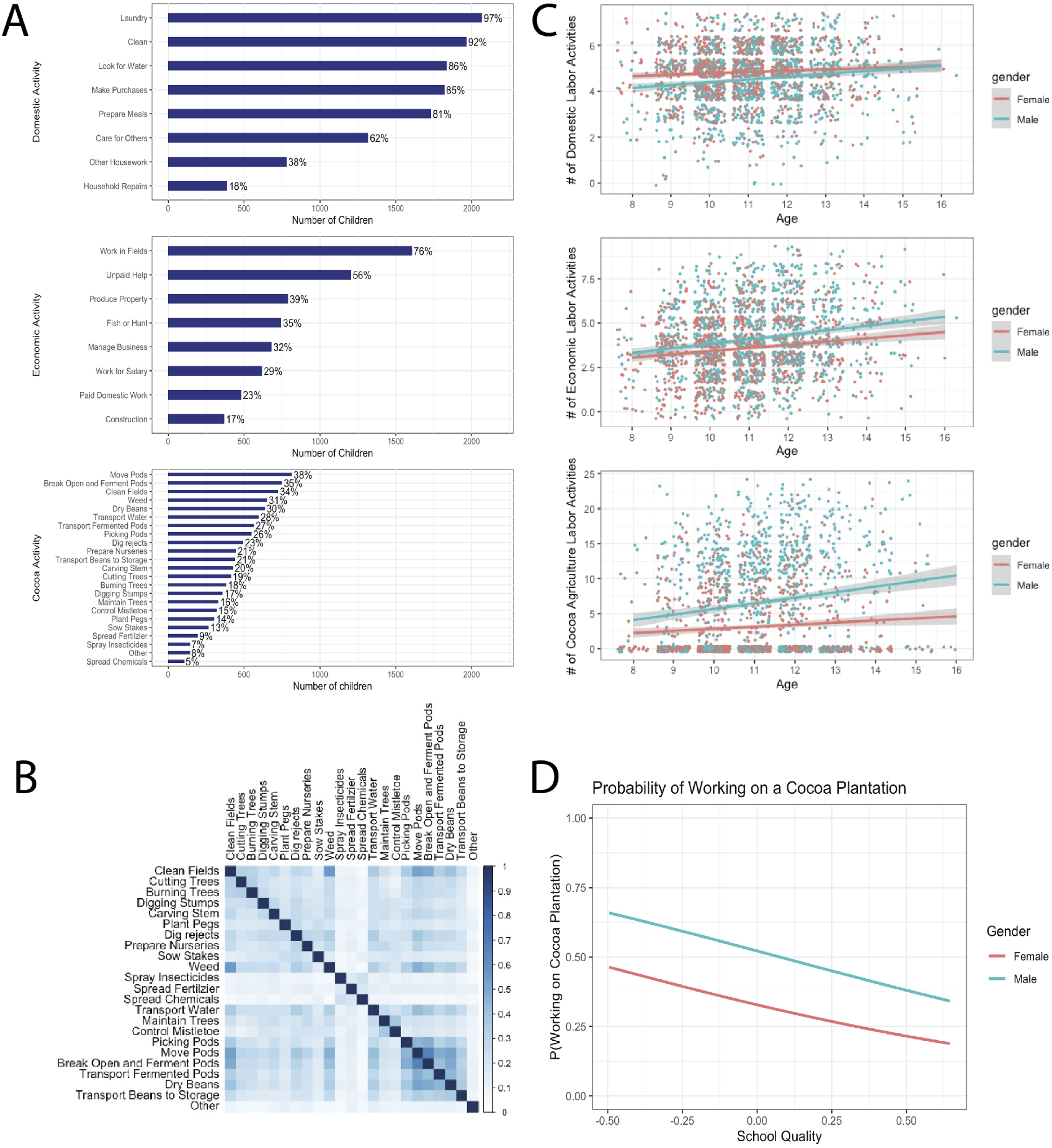 The proportion of children who reported each type of domestic, economic, and agricultural work activity is shown in Figure 1(A). The majority of children reported completing domestic and economic activities (e.g., >90% reported household chores such as cleaning and doing laundry, 86% reported fetching water). We explored the correlations within and between the three different work activity categories using Goodman–Kruskal τ. Our results indicate a moderate positive correlation between domestic and economic activities (r(2156) = 0.422, (A) Proportion of total children who reported performing work activities within each work category. (B) Goodman–Kruskal τ associations between each cocoa agriculture activity. (C) Relation between age, gender, and child work across domestic, economic, and cocoa agriculture activities. (D) Probability of working on a cocoa plantation as a function of school quality.