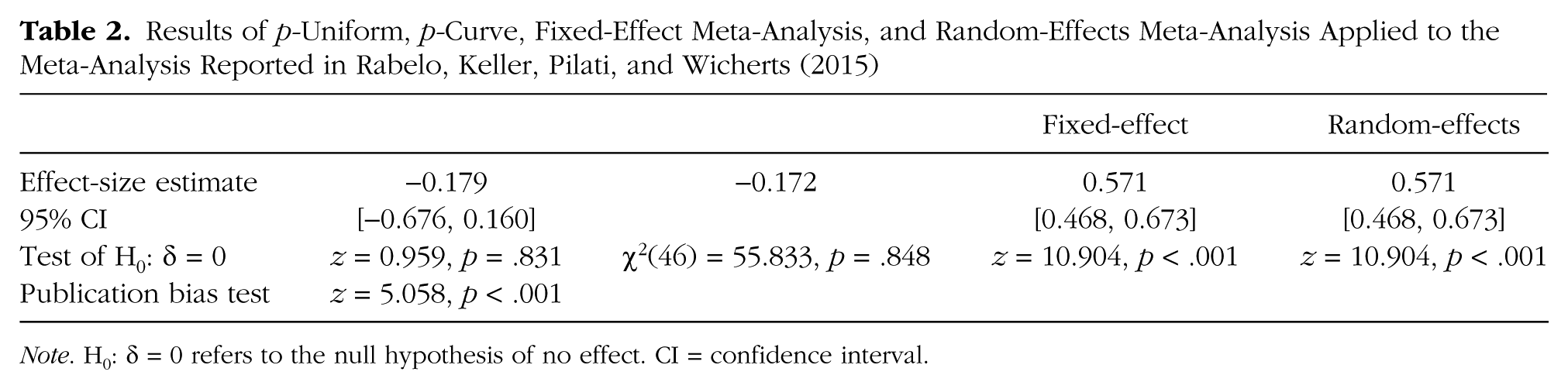 Results of p-Uniform, p-Curve, Fixed-Effect Meta-Analysis, and Random-Effects Meta-Analysis Applied to the Meta-Analysis Reported in Rabelo, Keller, Pilati, and Wicherts (2015)