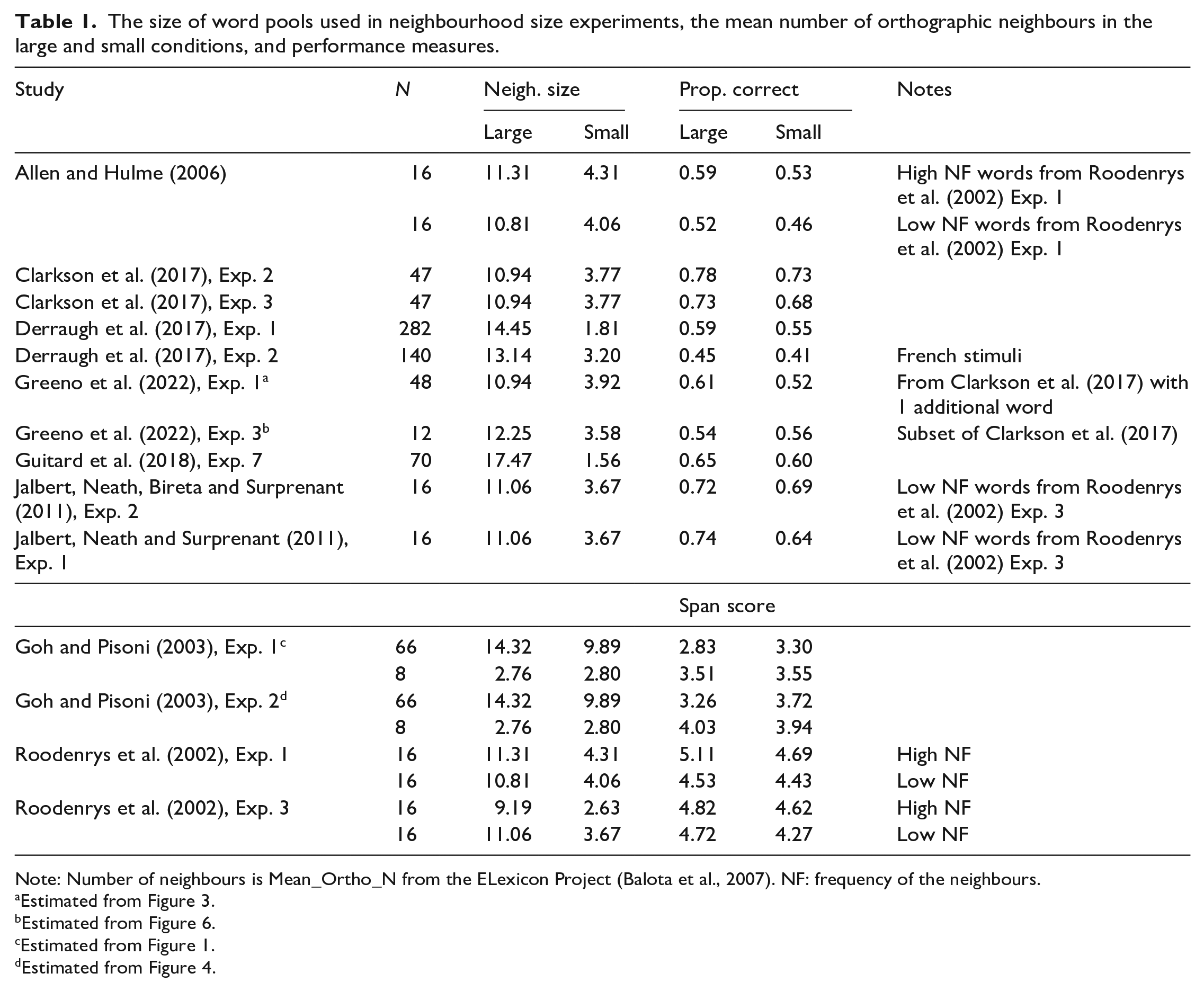 The neighbourhood size effect refers to the finding that words which have a large number of orthographic or phonological neighbours are better recalled on immediate memory tests than otherwise comparable words which have fewer neighbours (e.g., Allen & Hulme, 2006; Clarkson et al., 2017; Derraugh et al., 2017; Guitard et al., 2018; Jalbert, Neath, Bireta, & Surprenant, 2011; Jalbert, Neath, & Surprenant, 2011; Roodenrys et al., 2002). As can be seen in Table 1, these studies have used stimulus sets that vary in size from small to large.