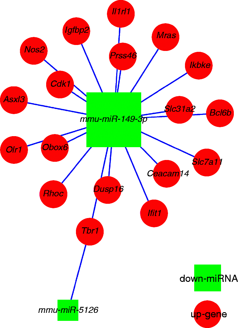 High-quality total RNA was extracted from RAW264.7 cells infected with B. melitensis M5-90 or B. melitensis M5-90-Δomp25 as described previously.12 Gene expression profiling and analysis was performed using the Agilent platform (V2, G4846A/26655) by LC-BIO Co. (China). Significantly differentially expressed genes (DEGs) (fold change ≥2) were selected for further miRNA–mRNA conjoint analysis.