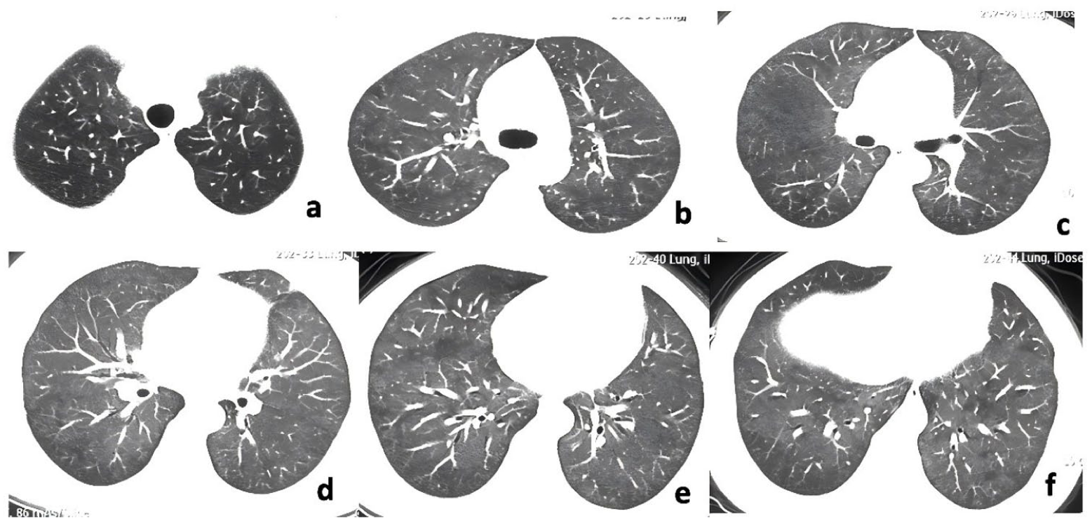 The day after admission, laboratory investigations revealed pancytopenia with leukocyte count 1.92 × 109/L (neutrophils 1.13 × 109/L, lymphocytes 0.56 × 109/L), anemia (hemoglobin 102 g/L), and thrombocytopenia (84 × 109/L). Liver, cardiac, and renal function tests showed no abnormalities. Sputum bacterial and fungal smears showed no pathogenic microorganisms. Elevated inflammatory markers included D-dimer (596 ng/mL), lactate dehydrogenase (LDH, 1055.6 U/L), and ferritin (522.4 ng/mL). The level of serum interleukin-10 (IL-10) rose to 153.70 pg/mL. Autoimmune serology revealed positive antinuclear antibodies with a cytoplasmic granular pattern (titer 1:320) and elevated myositis-specific anti-SRP antibodies (+++). Serum krebs von den lungen-6 (KL-6) was elevated at 670 U/mL. Chest CT revealed diffuse GGOs with peribronchiolar distribution and adjacent consolidation in both lungs (Figure 3(a)–(f)). Pulmonary function testing demonstrated significantly impaired gas exchange capacity with DLCO at 39.4% predicted on December 17, 2021.
