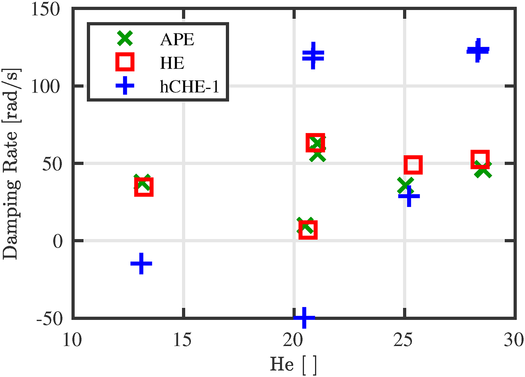 When dropping the energetic consistency with the hCHE-2 setup by using the boundary conditions for stagnant fluids, the damping rates are expected to further deviate in comparison to the reference APE. However, while performing the underlying study with arbitrary mean flow fields, the results of the hCHE-2 were observed to match the results of the Helmholtz equation and the APE outstandingly well, when employing the energetically inconsistent boundary conditions of the Helmholtz equation. Figure 9 shows the comparison of the eigenvalues computed for the hCHE-2 setup with those of the APE and the HE.