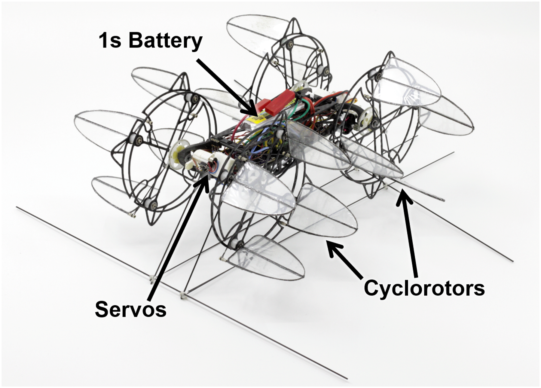 Top view of the quad-cyclocopter with components labeled showing arrangement on the airframe.