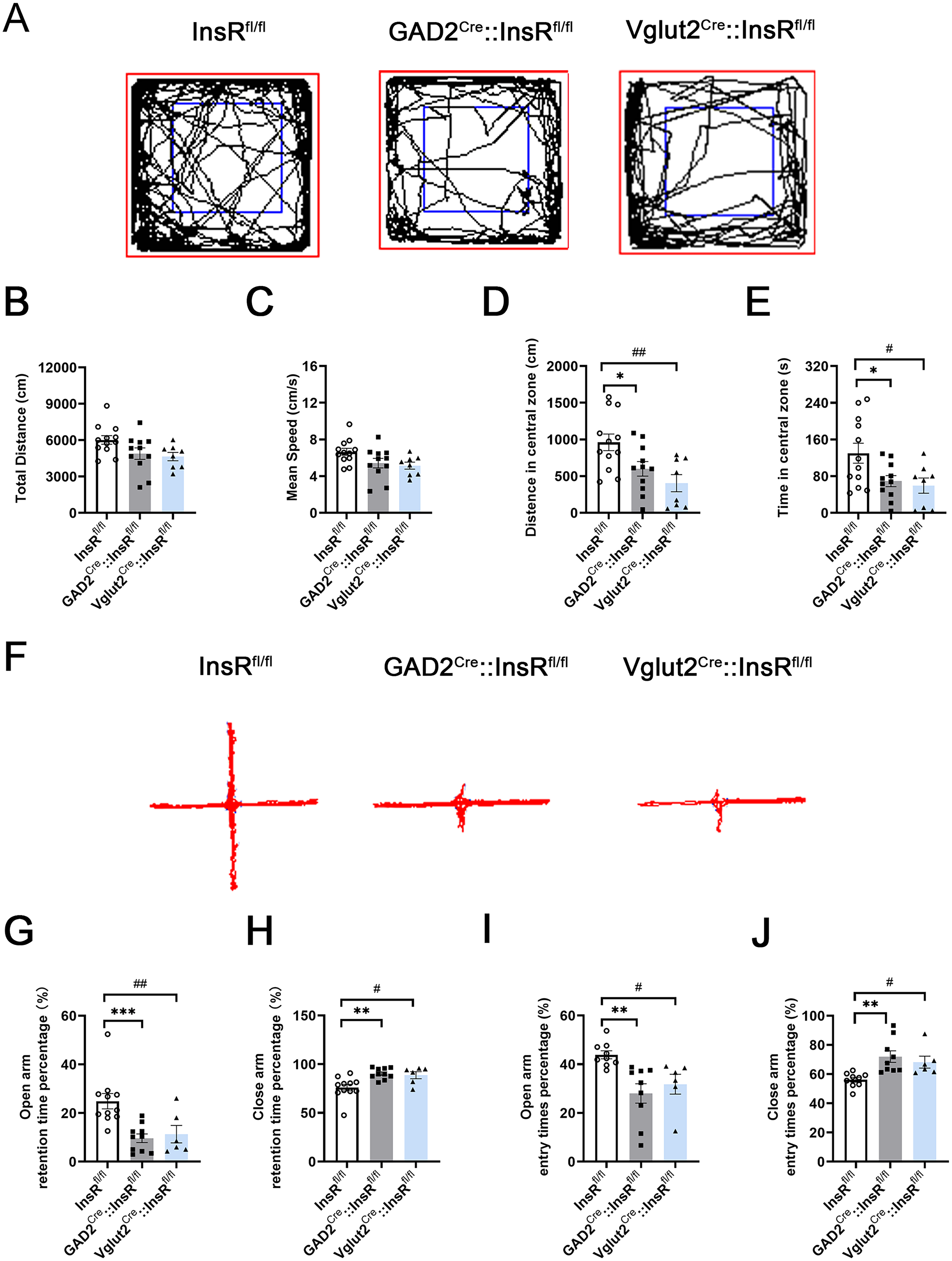 Similarly, the percentage of times to enter the open arm or the close arm of GAD2Cre::InsRfl/fl and Vglut2Cre::InsRfl/fl groups were prominent differences (Figure 7I and J, open-arm entry times percentage (%): InsRfl/fl vs. GAD2Cre::InsRfl/fl,