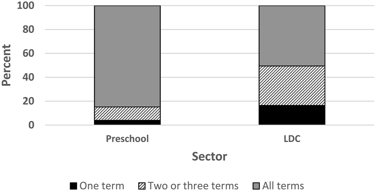 The results of our analyses highlight important features of ECE participation in low SES communities that have not been previously explored. First, we found that attendance was more stable for children who attended a centre- or school-based preschool than children who attended a long day care centre: 85% of children attended the same preschool centre/school for all four terms compared to 51% of children enrolled in long day care centres. One -third (33%) of children enrolled in long day care centres attended for two or three terms, and one-sixth (16%) attended for only one term. These figures suggest that 49% of children in low SES communities may be attending an ECE program for less than one year before the start of school. Over half of the single-term attenders started in Term 4 which suggests families may have wanted their child to experience a formal ECE program before starting school the following year. However, there may have been other reasons for these limited patterns of attendance. Studies have shown that, families may stop and start ECE in different settings for a variety of reasons, and more changes may be associated with higher levels of advantage (Claessens & Chen, 2013) or disadvantage, particularly for families receiving childcare subsidies (Ha et al., 2012).
