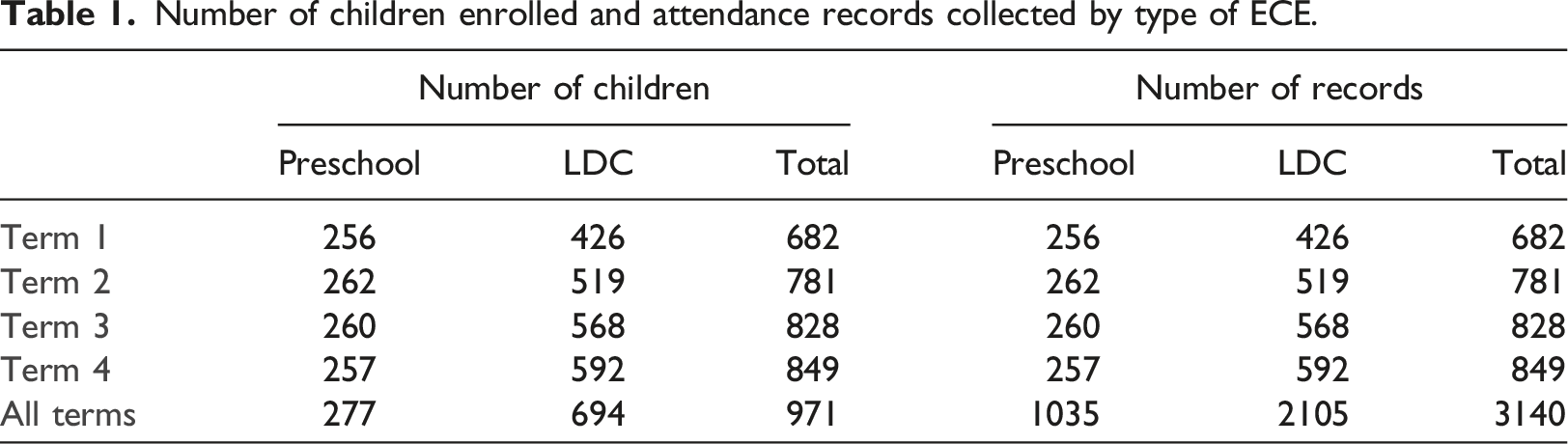 The data set for analysis was then created in a sequence of steps. First, children’s records for each centre/school were merged to generate overall summary scores for the number of enrolled days, the percentage of days attended, and the number of hours attended for Terms 1, 2, 3, and 4. We combined centre/school summary scores by type of ECE to organise the data into two groups: Preschool and Long Day Care.