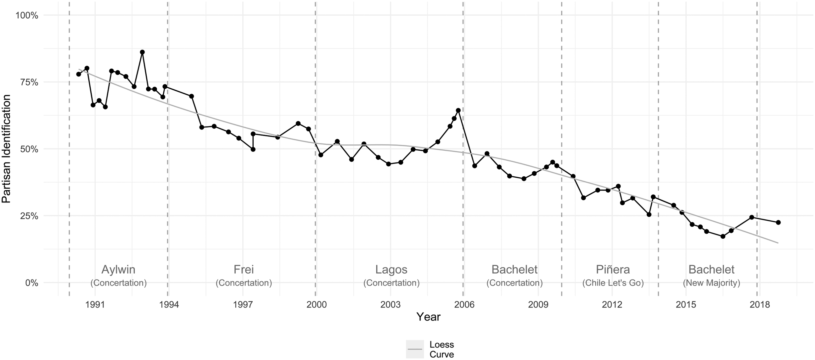 According to data from the Centro de Estudios Públicos (CEP), levels of partisan identification in the early 1990s were exceptionally high. While there is some degree of variation, between the year 1990 and 1994, during Aylwin’s administration (1990–1994), the levels of party identification remained over 60%, reaching 86% in December 1992. Figure 1 shows that the subsequent downward trend in partisanship can be divided into three different periods. Firstly, there is an initial decay from 1994 to the early 2000s, a period that corresponds to Eduardo Frei's government, then a second stage of stabilization around mid-levels of partisanship between the years 2000 and 2006 during the Ricardo Lagos administration, and finally, a third stage characterized by the total collapse of the levels of partisanship between 2006 and 2018. This downward trend hit a record low level of 17% in July 2016, during Michelle Bachelet second term in office.