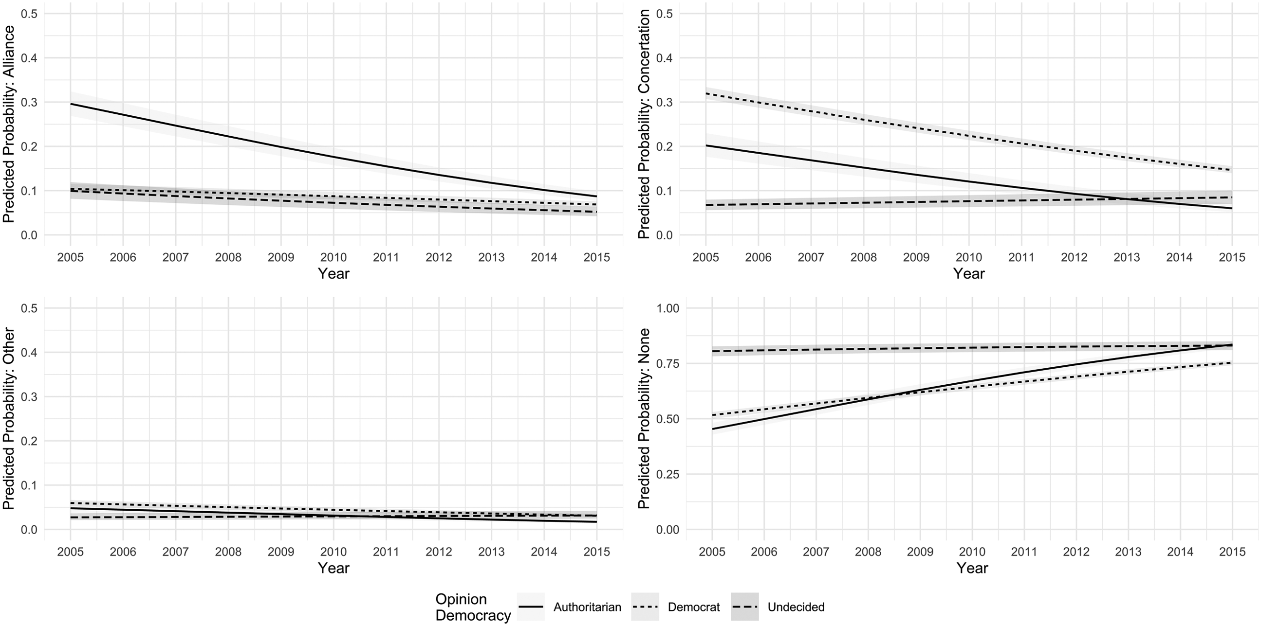 Table 2 shows the results of the multinomial regression model. In this case, the dependent variable is coded with four values noted above (Alliance, Concertation, Other and None). The model includes all the variables used in the third logistic regression model. Given that multinomial regression models are hard to interpret, I provide a graphical interpretation of the effects of interest on Figure 6.
