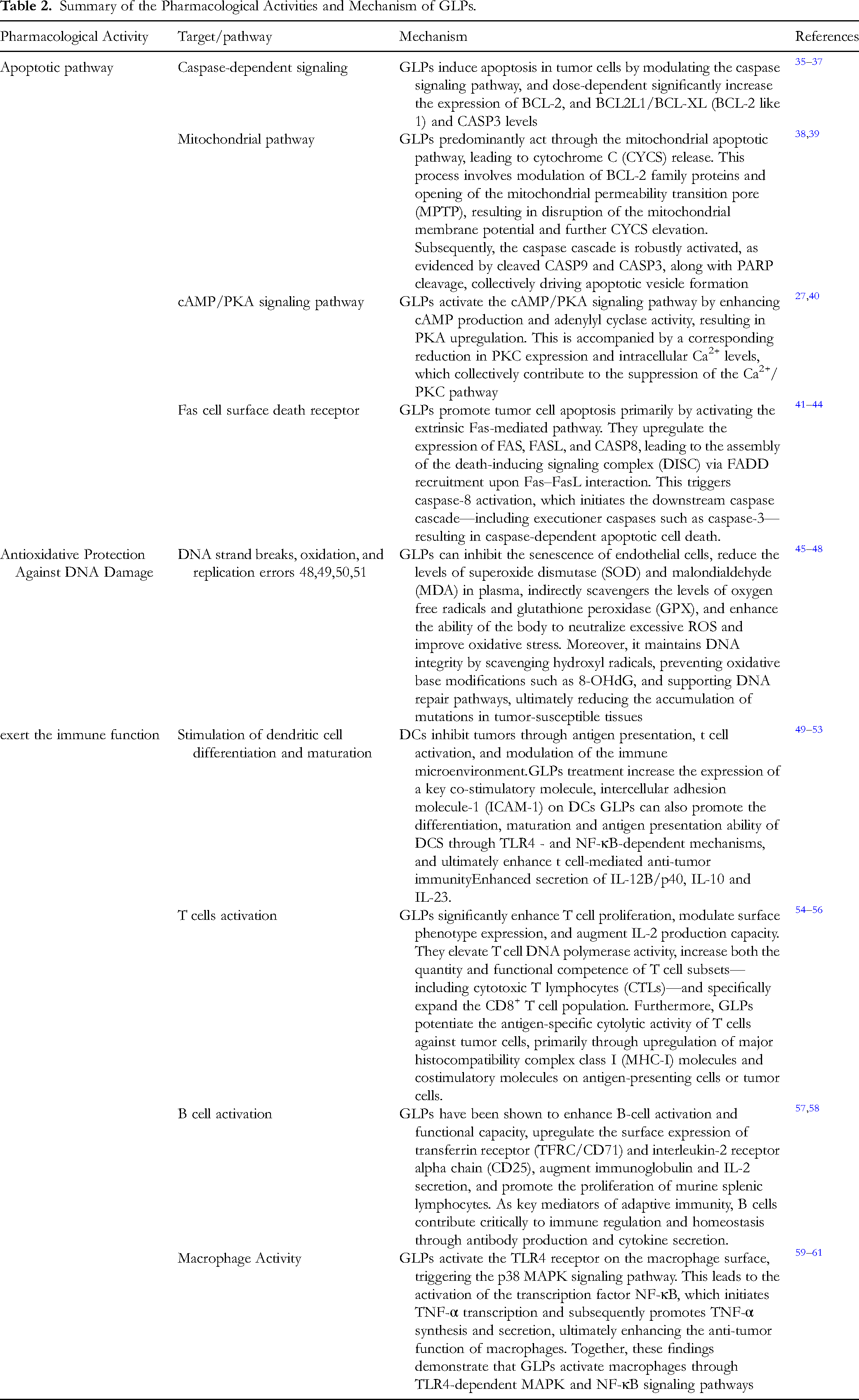 Due to their inherently low cytotoxicity, it was initially proposed to use GLPs as an immunomodulator to facilitate clinical anti-tumor therapy. However, as research progressed, they were found to exert certain inhibitory effects on various cancers, including osteosarcoma, melanoma, breast, gastric, and hepatocellular carcinoma. 13