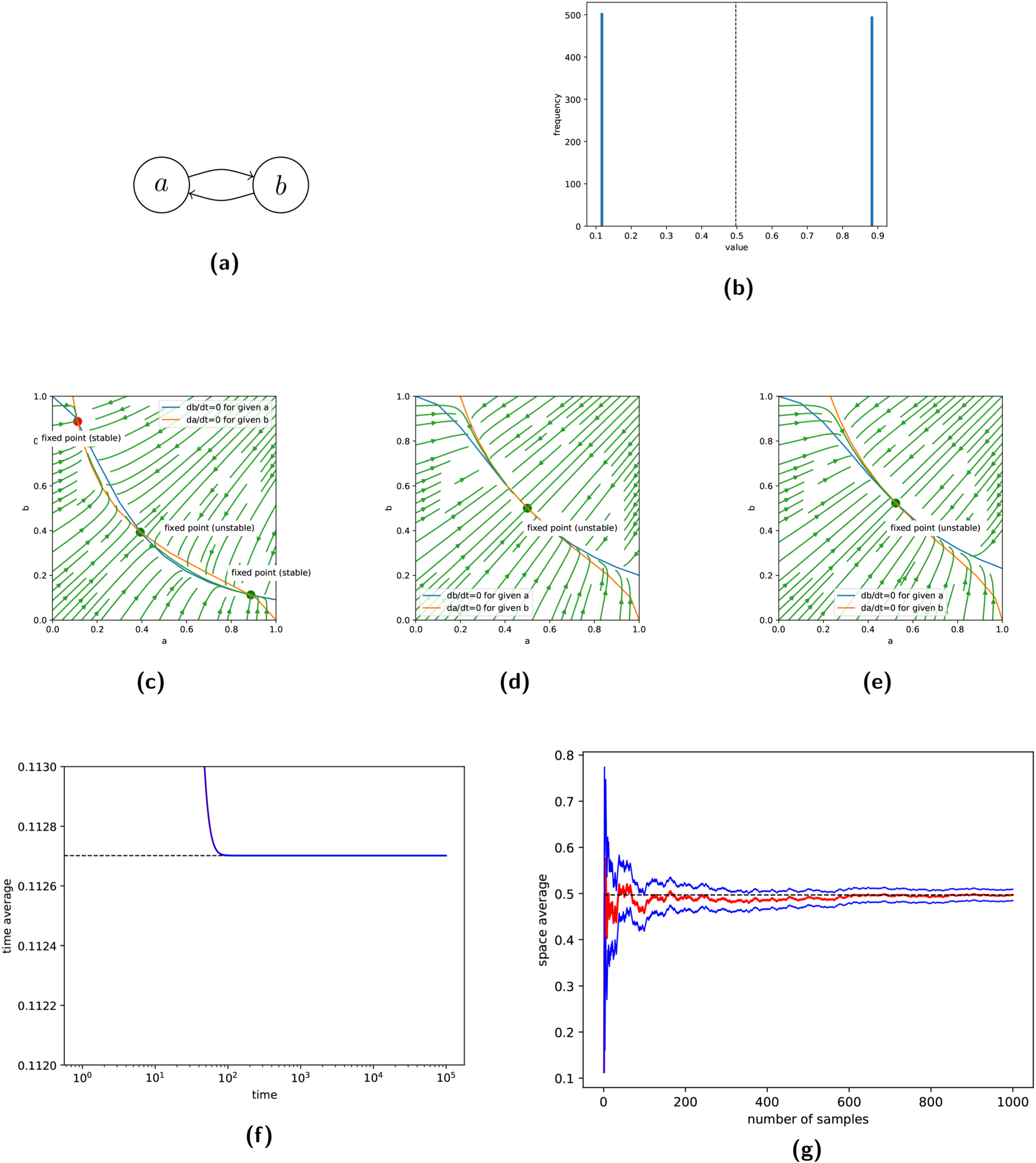 We take the space average of the time averages (if they exist). The space average is a single value. Trajectories and their time averages depend on the initial values. We may accidentally pick up an exceptional trajectory if a predetermined initial value is used. For example, as to the dilemma of Example 3.1, if we use the initial value at