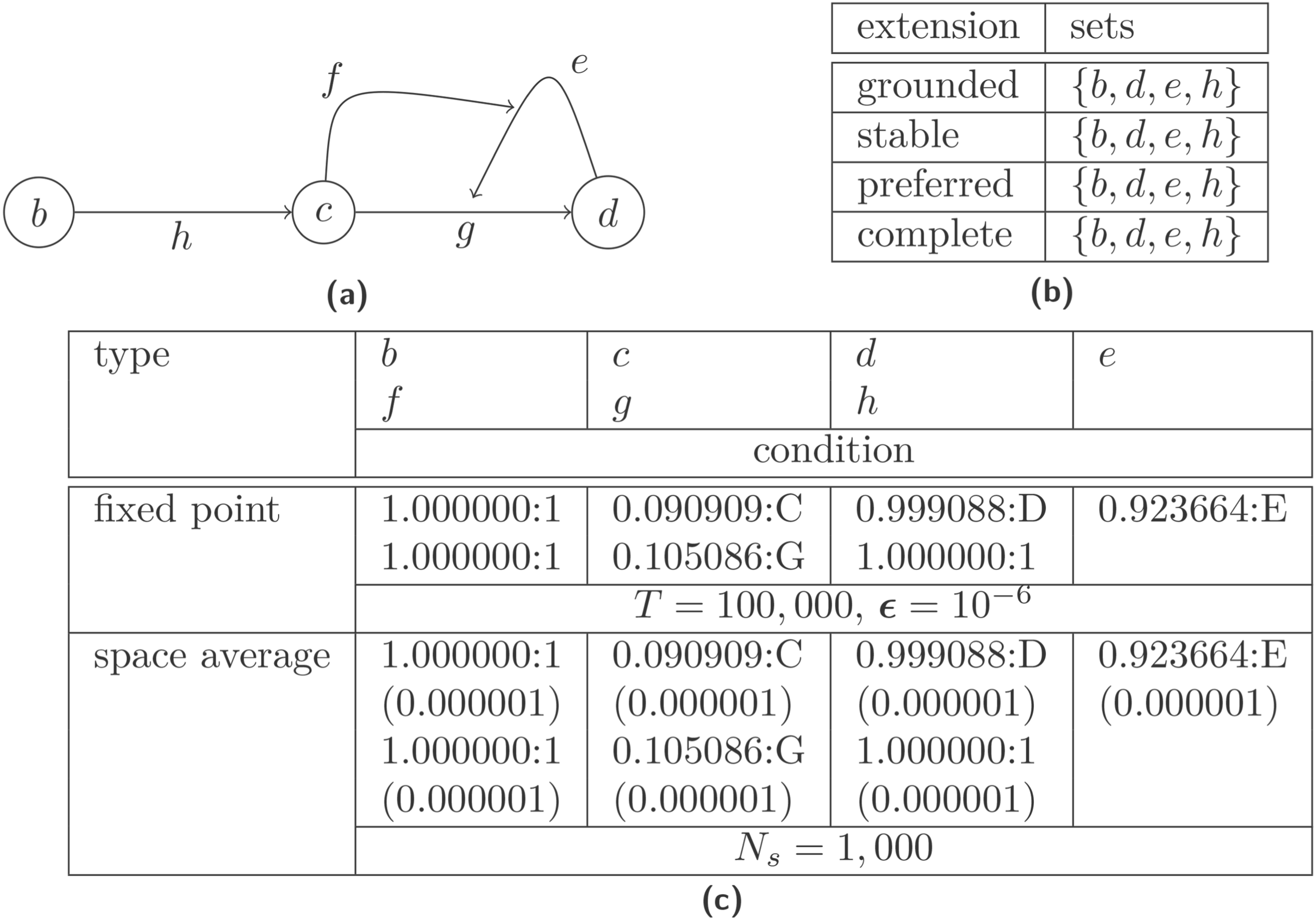 We concentrated on the fundamental theoretical aspect of DECRAG, and there are still many research topics. We want to study the theoretical aspect of the framework further: the relationship between the structure of argumentation graphs and the behaviors of their differential equations, the meaning of the partially clasped cost and the differential equations generated from it, the condition of the existence of the time average, and better estimations of the variances. We studied the relationship between existing models and DECRAG by examples in Section 3 and found Property 19. We would like to study the relationship with more existing models theoretically and empirically. We applied a preliminary version of DECRAG to the limited cases.40,41,52 We would like to extend these experiments to more practical situations to clarify DECRAG’s applicability. We also want to study artificial argumentation graphs by DECRAG, extending the experiment 40 on argumentation graphs in International Competition on Computational Models of Argumentation (ICCMA) (https://argumentationcompetition.org/).