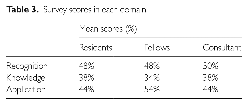 We distributed the survey to 305 doctors: 265 completed the first three domains and 259 completed all the domains. The details of the participants are shown in Table 1. We found no difference in the overall mean score between residents (6.5 ± 1.9), fellows (6.8 ± 1.8) and teaching faculties (6.5 ± 2.2) (Table 2). All scored similarly in the recognition, knowledge and application domain of the survey (Table 3). When subcategorised, we found that the gastroenterology sub-speciality (