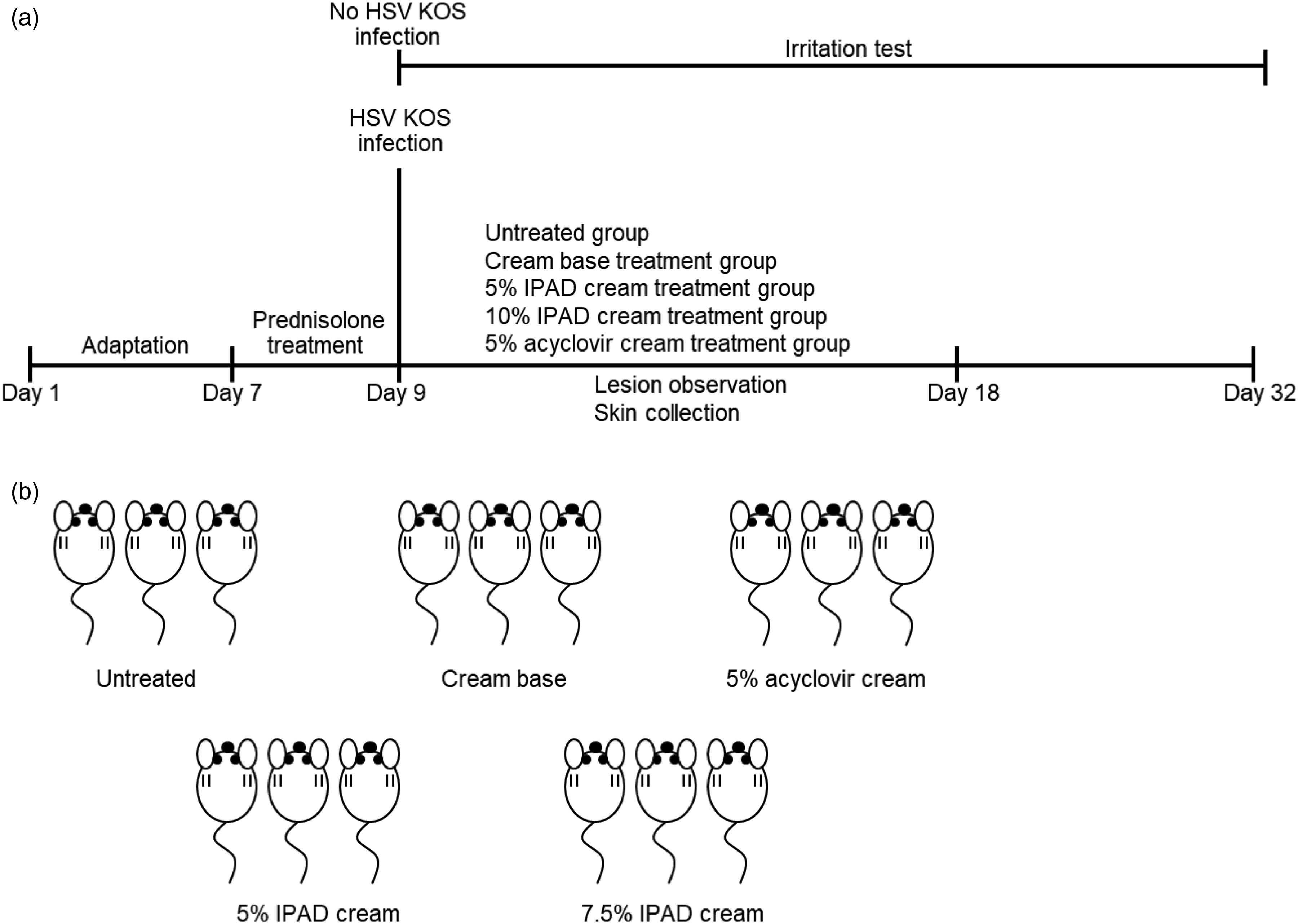 Schematic diagram of experiments using a mouse model for testing IPAD cream on anti-HSV infection. (a) Schematic diagram of each experimental step in a mouse model was shown. (b) After HSV KOS infection on both sides of mouse midflank skin, untreated, cream base, 5% acyclovir cream, 5% IPAD cream and 7.5% IPAD cream were divided in to each five group and applied to tropical administration on mice skin lesion in both midflank skin.