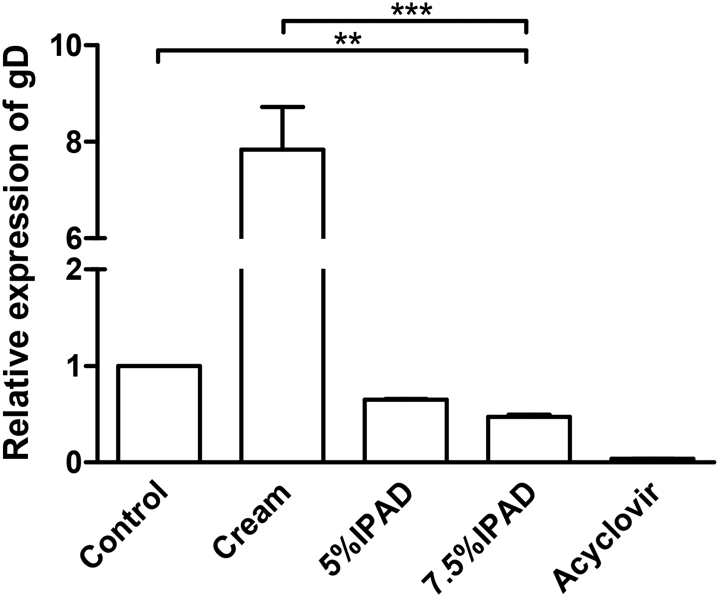 Effect of topical administration of 5% and 7.5% IPAD cream on inhibition of HSV gD expression in mice cutaneously infected with HSV-1 KOS. HSV-1 gD expression was investigated by qRT-PCR in the negative control group, base cream, 5% acyclovir, 5% and 7.5% acyclovir cream groups at day 10. The graph was created using Prism 5 for Windows.
