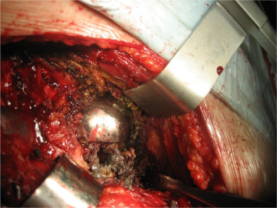 Metallosis tissue and metal debris in revision surgery. Osteolysis in femoral neck.