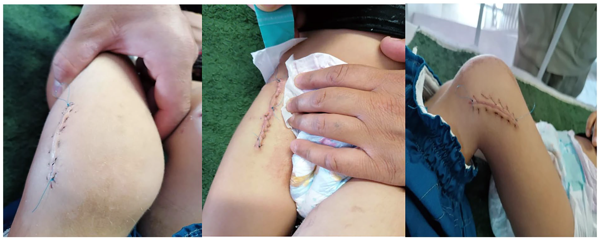 Post-arthrotomy images of the patient’s knees and right hip, showing the incision site following joint surgery. This procedure was performed to drain the synovial fluid and alleviate joint effusion as part of the initial management of septic arthritis.
