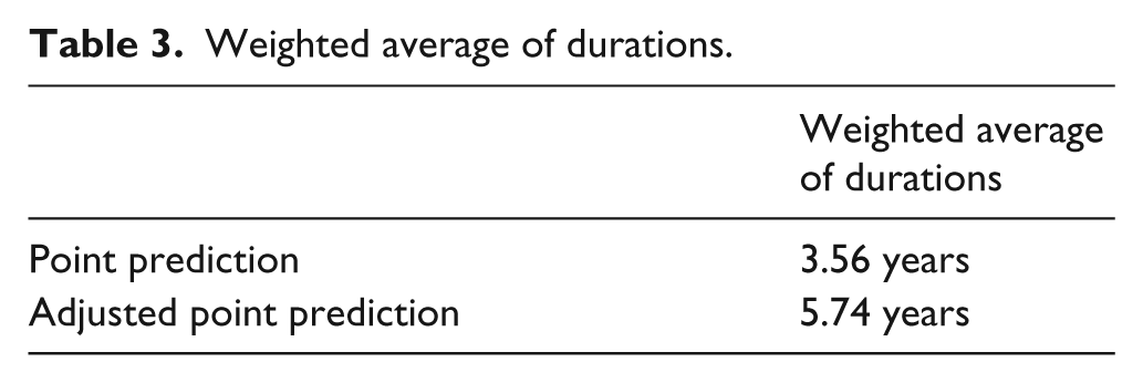 In light of this, finally, if we explicitly address the probabilities we assign to each of the three scenarios for which we estimated the duration of the Syrian insurgency, in our view scenarios 1 (irregular insurgency) and 2 (conventional insurgency without economic support) are equally likely, but less so than scenario 3 (conventional insurgency with economic support). Hence, we assign probabilities of 0.25 to scenarios 1 and 2, while the third scenario receives a value of 0.50, which in turn allows us to calculate a weighted average of the resulting predictions. Table 3 summarizes the results. While the weighted average of the point prediction is fairly close to the non-weighted point prediction of scenario 3 (Table 2), the weighted average of the adjusted point prediction suggests a duration of 5.74 years. Depending on the start date of the Syrian civil war, this could imply an end in late 2017. The prediction is fairly similar to our most realistic scenario even when using a weighted average of predicted durations across all scenarios.