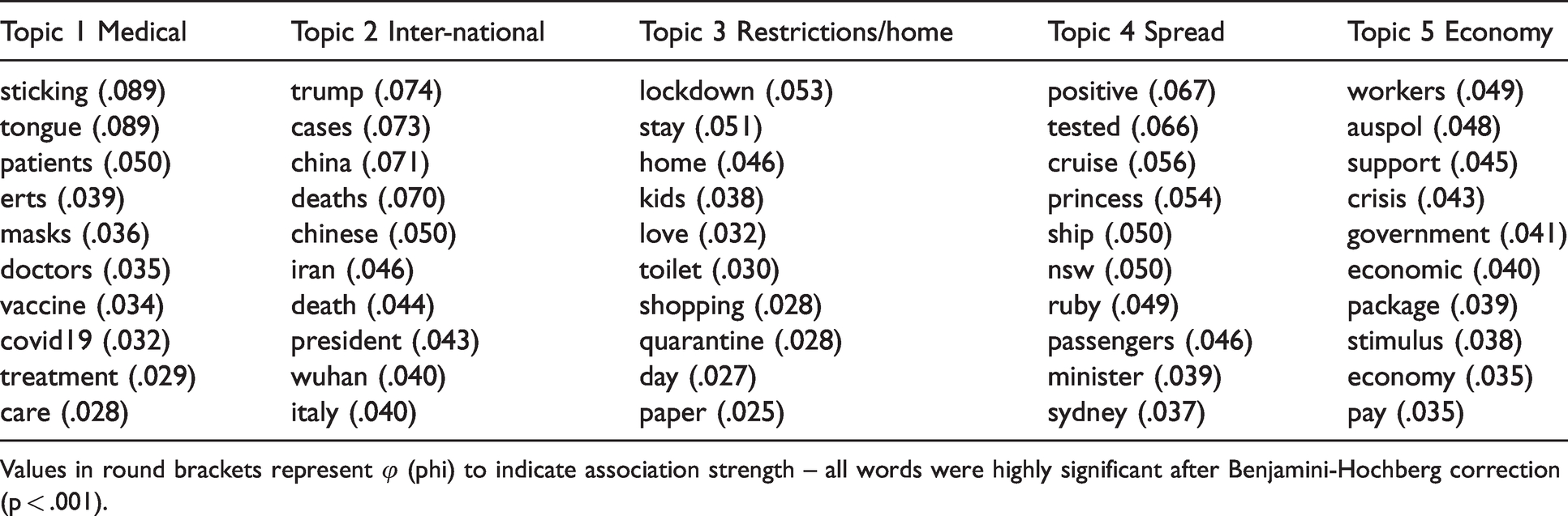 Table 2 shows that the topics identified through LDA-based topic modelling are aligned with five thematically coherent topics: Topic 1 encompasses medical issues; Topic 2 is characterized by international affairs-related discourse; Topic 3 contains tweets dealing with issues related to the restrictions and the repercussions of the lockdown (and how they affect family life); Topic 4 revolves around themes that focus on how and where COVID-19 spread; and Topic 5 deals with the economic consequences of COVID-19.