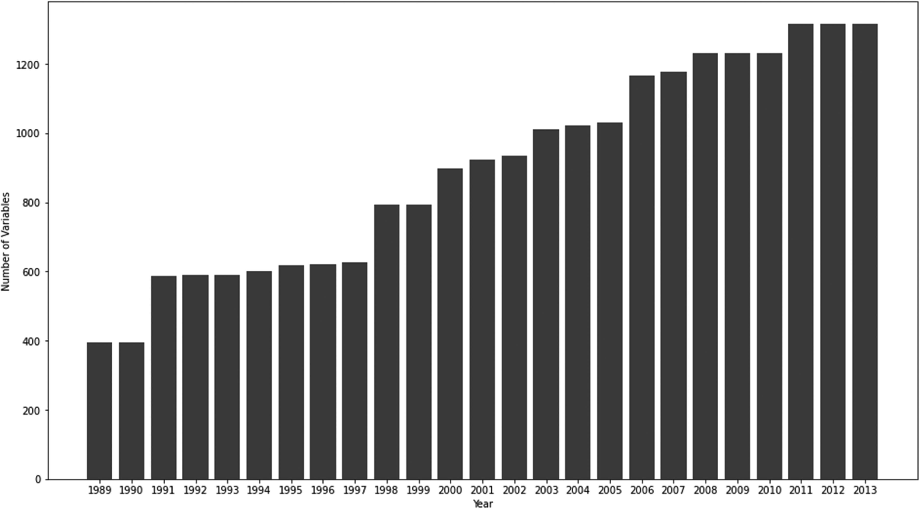 The PADOC collects details spanning almost the entirety of an incarcerated person's life in and outside the prison ranging from their date of birth to any notes recorded by their therapist during a treatment session. A good example of the reach of the data is the fact that, according to the data dictionary, the PADOC is collecting data about the criminal history of anyone who visits an incarcerated person. Figure 4 illustrates the growth in the number of variables starting in 1989, the year of the Camp Hill Riots. Currently the PADOC collects data for more than 1200 variables for each incarcerated person and the number of variables being collected increases over time.