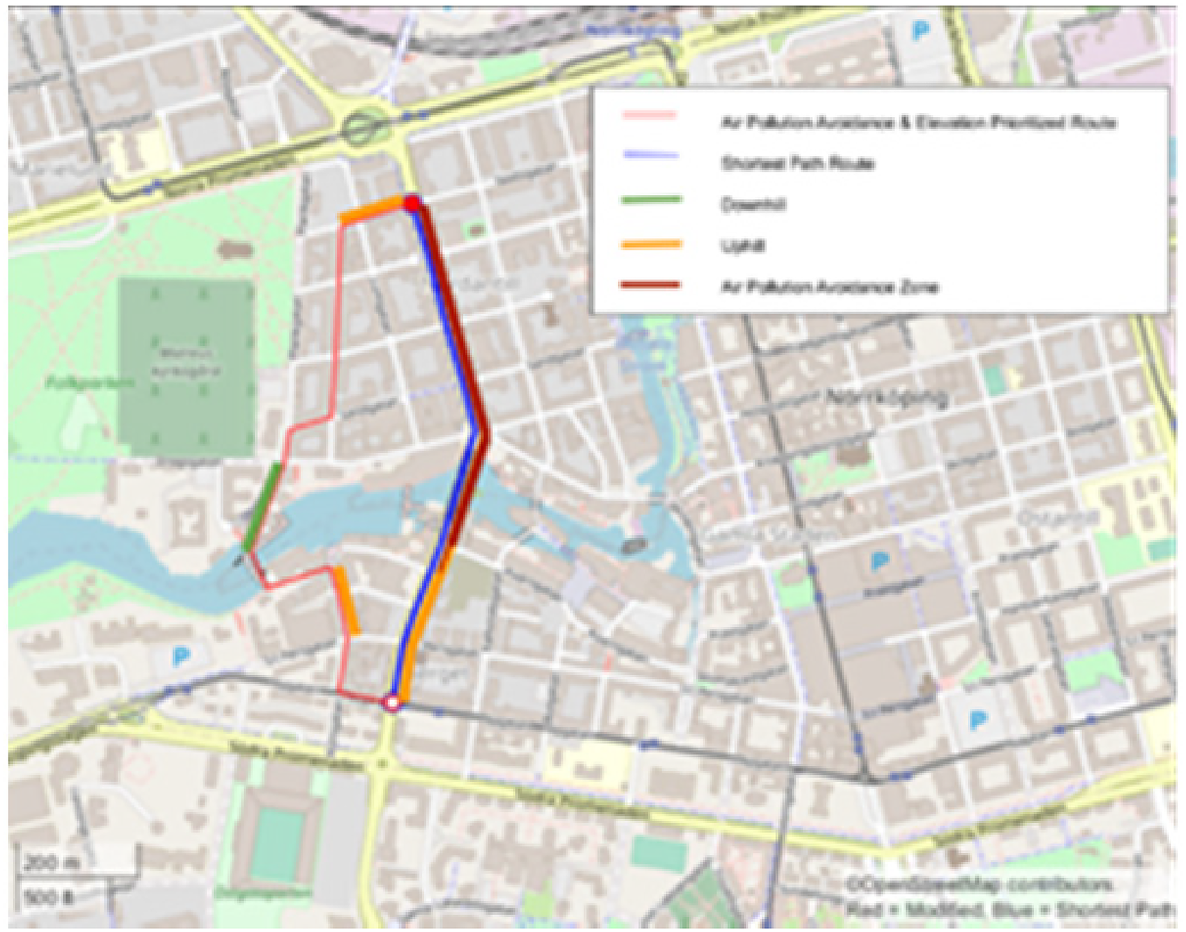 Elevation & air pollution avoidance prioritized versus shortest path for micromobility (Grachek, 2021: 39). With permission.