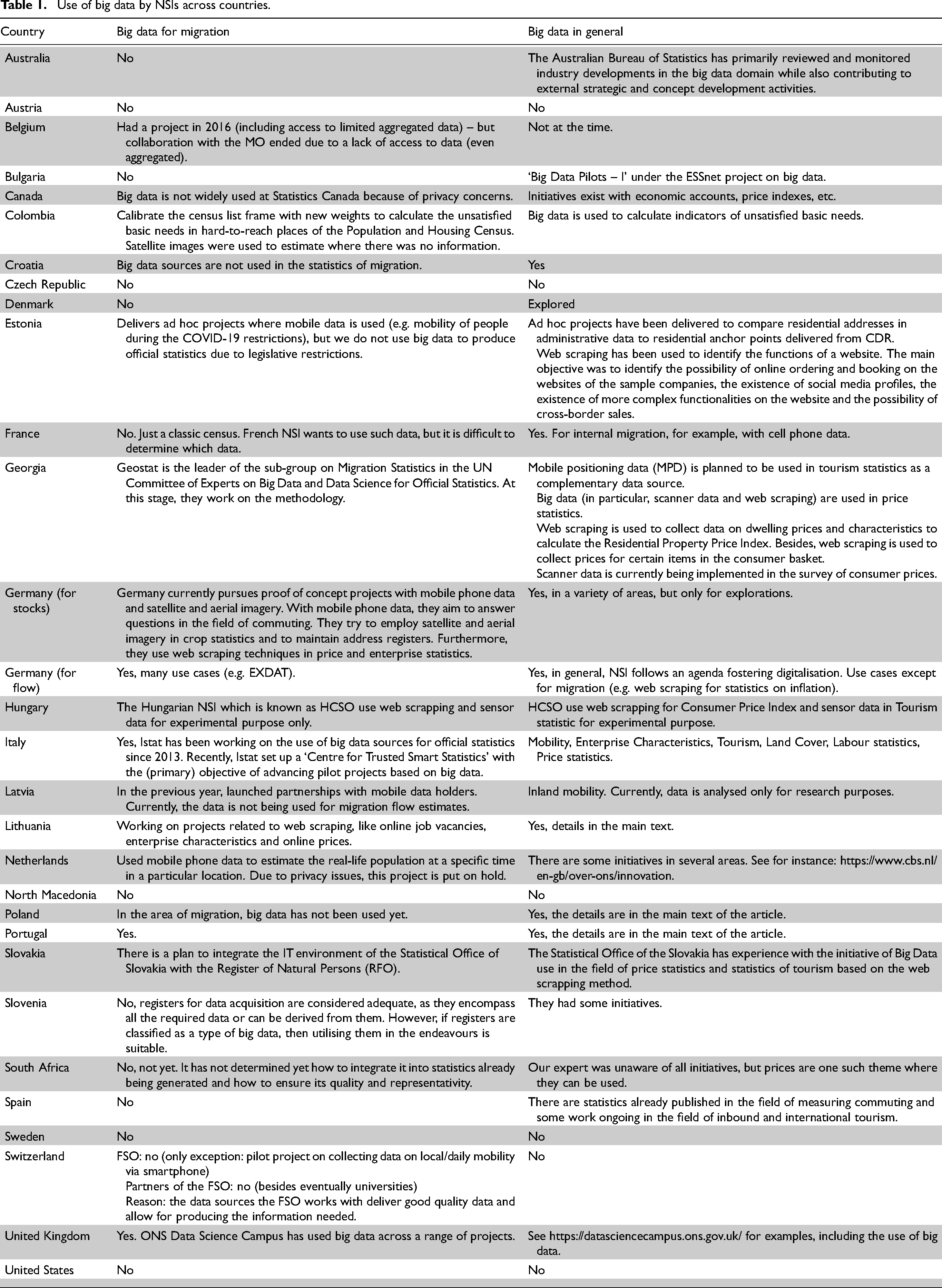 Innovative methods are being used to improve official statistics and estimates for human populations, and survey data are used to evaluate and improve the quality of insights derived from big data across disciplines (Hill et al., 2020). Different methods and strategies are used to complement traditional statistics with big data (Hsiao et al., 2023; Japec and Lyberg, 2020). As part of this research, it was important to investigate which innovative methods NSIs are using, particularly to extract official statistics on migration, and what the most common data sources are. Experts from Australia, Austria, Belgium, Bulgaria, Canada, Columbia, Croatia, Czech Republic, Denmark, Estonia, France, Georgia, Germany, Hungary, Italy, Latvia, Lithuania, the Netherlands, North Macedonia, Poland, Portugal, Slovakia, Slovenia, South Africa, Spain, Sweden, Switzerland, the United Kingdom and the United States replied to the questionnaire and sent their responses through email and other forms of communication. Among these countries, 15 of 29 used big data for migration, had a pilot project to experiment with doing so or have been involved in joint initiatives with other countries and data owning private companies to utilise big data. Table 1 below shows which countries use big data for general purposes and which countries use it for migration.