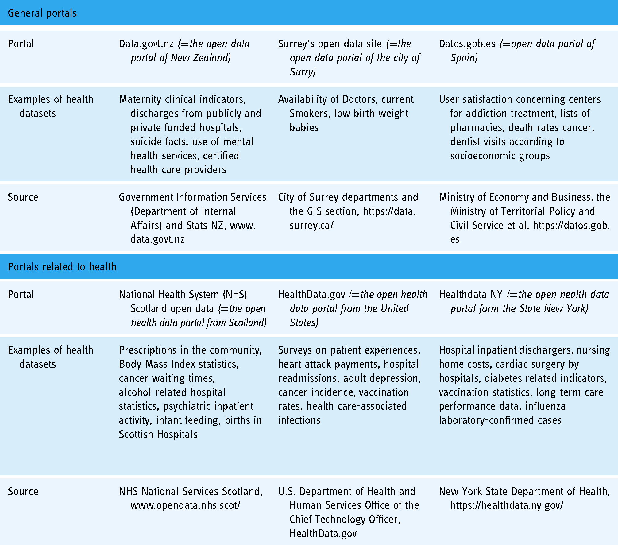Following these initiatives that promote open data policies, the authors expect to encounter some practical examples. Consequently, the creation of the health data ecosystem can also take into account existing examples. Secondarily, these examples provide an opportunity to assess the proposed working definition for open health data. Observing open data in practice, one can notice that already several governments publish few health datasets on their national, regional, or urban open data portals.19,28 In these cases, health is one of many topics among for instance culture, tourism, or education on which open data can be found. As shown in Table 1, the health datasets on general open data platforms as the ones from New Zealand or the Canadian city of Surry range from statistics on smokers to the use of mental health services. Besides the inclusion of the health topic on general platforms, some limited examples exist of portals exclusively dedicated to the topic of health.