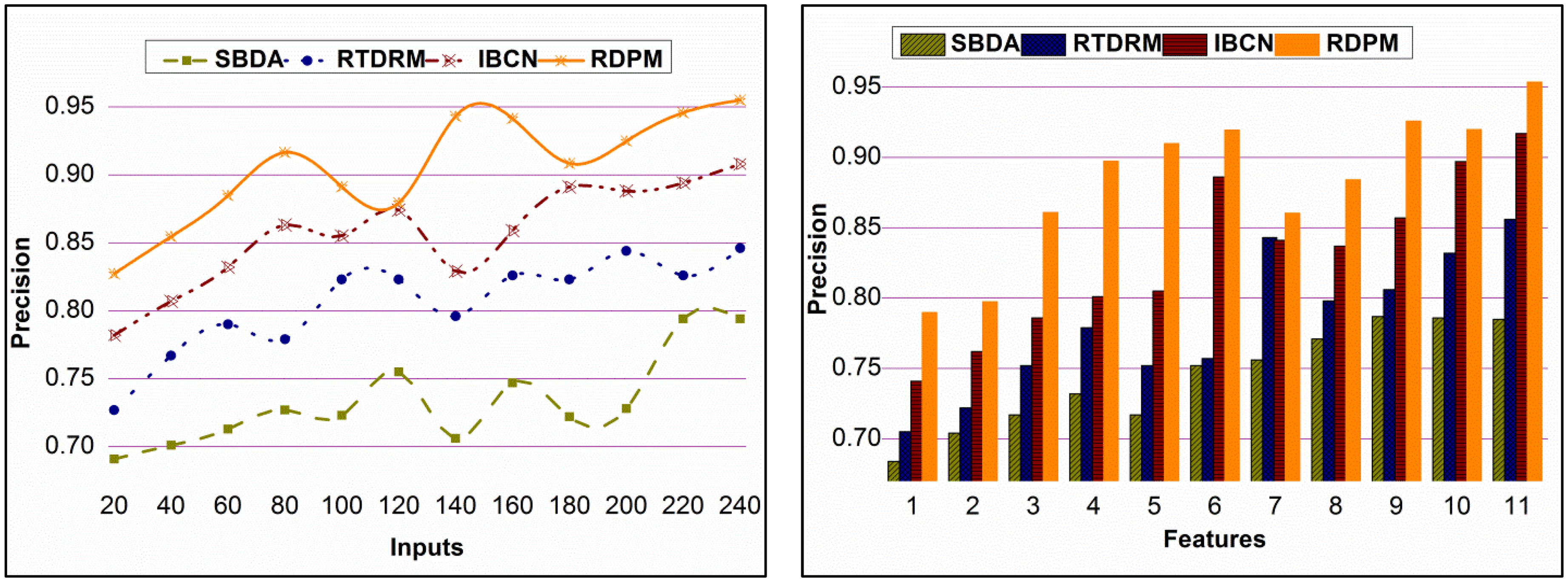 As shown in Figure 11, a comparative examination of precision is offered under various data inputs and attributes. The recommendation is retained in different