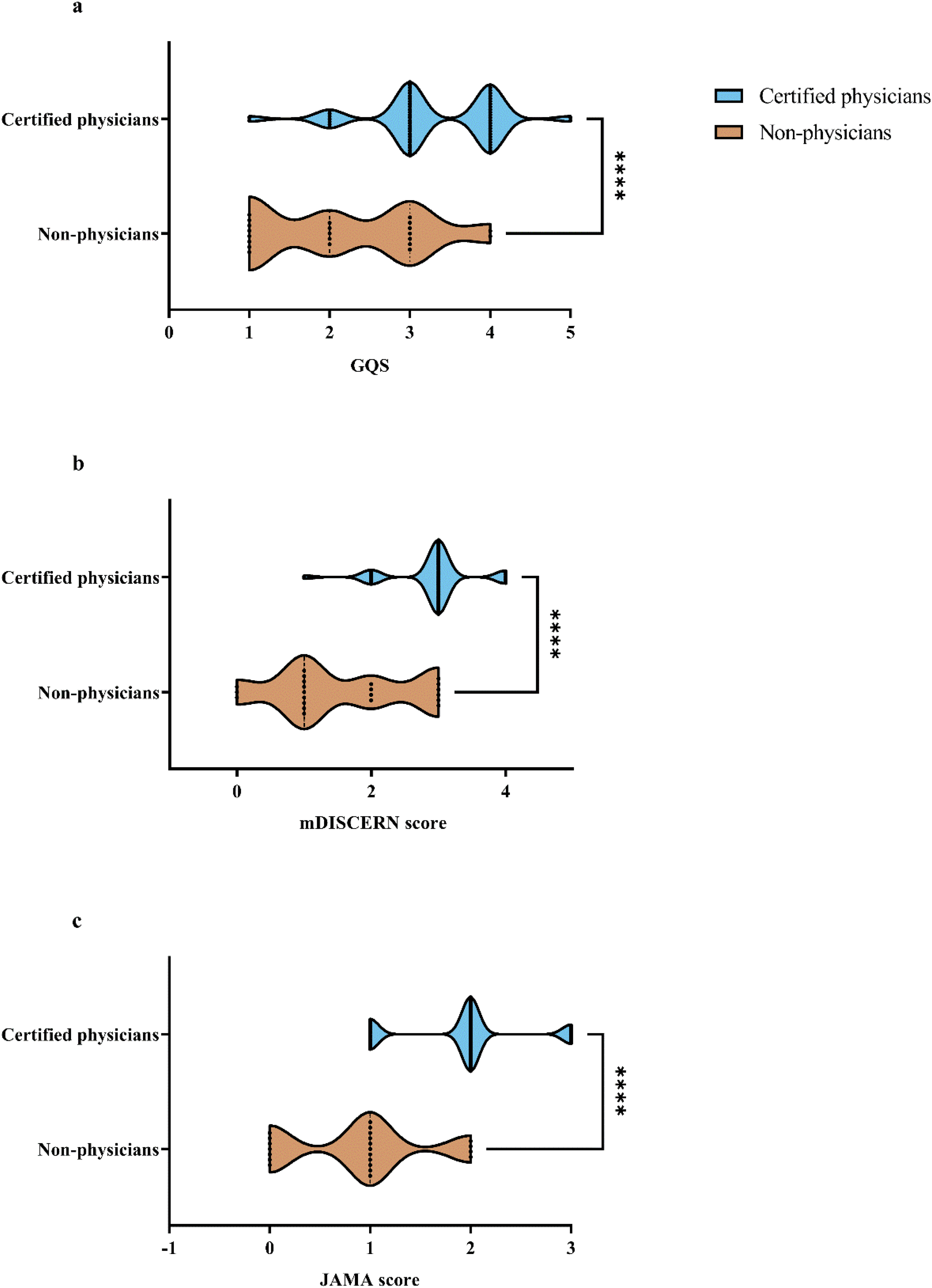 Comparison of assessment scores between certified physicians and non-physicians. ****
