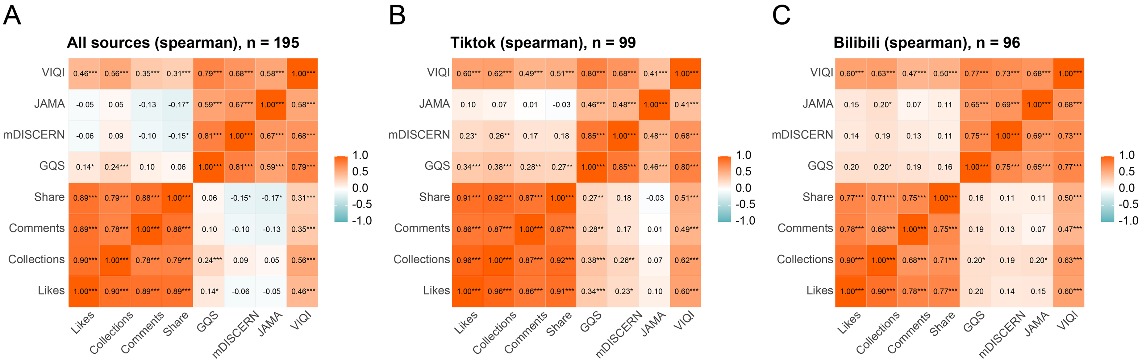 Platform-stratified analyses revealed similar patterns with some divergences, Figure 5B and Figure 5C. On TikTok, mDISCERN, GQS, JAMA, and VIQI were positively interrelated rho approximately 0.41–1.00 and each showed only weak associations with engagement metrics. Shares on TikTok were essentially uncorrelated with JAMA, reinforcing the decoupling between disclosure standards and virality. On Bilibili, quality instruments were again moderately to strongly correlated with one another, and their associations with engagement were minimal. The magnitude of engagement–engagement correlations was slightly lower than on TikTok yet remained substantial. Taken together, these matrices corroborate the hypothesis that user engagement is a poor proxy for objective informational quality, while production quality aligns only partially with evidentiary rigor and transparency.