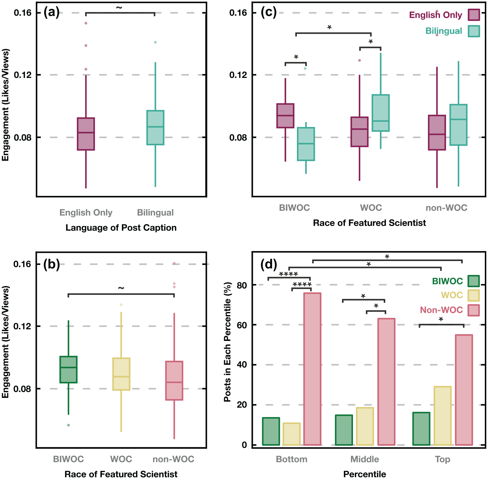 Engagement of Women Doing Science Instagram posts across (a) language (English only vs bilingual captions) and (b) race (BIWOC, non-BIWOC, vs non-WOC). (c) Engagement across the intersection of race and language. WOC had higher engagement for bilingual posts, but posts of BIWOC had the opposite trend. (d) A breakdown of the bottom 10%, middle 10%, and top 10% of posts and their relative proportion of BIWOC, WOC, and non-WOC in each percentile. The proportion of WOC increases from bottom to top percentiles, while non-WOC decreases.