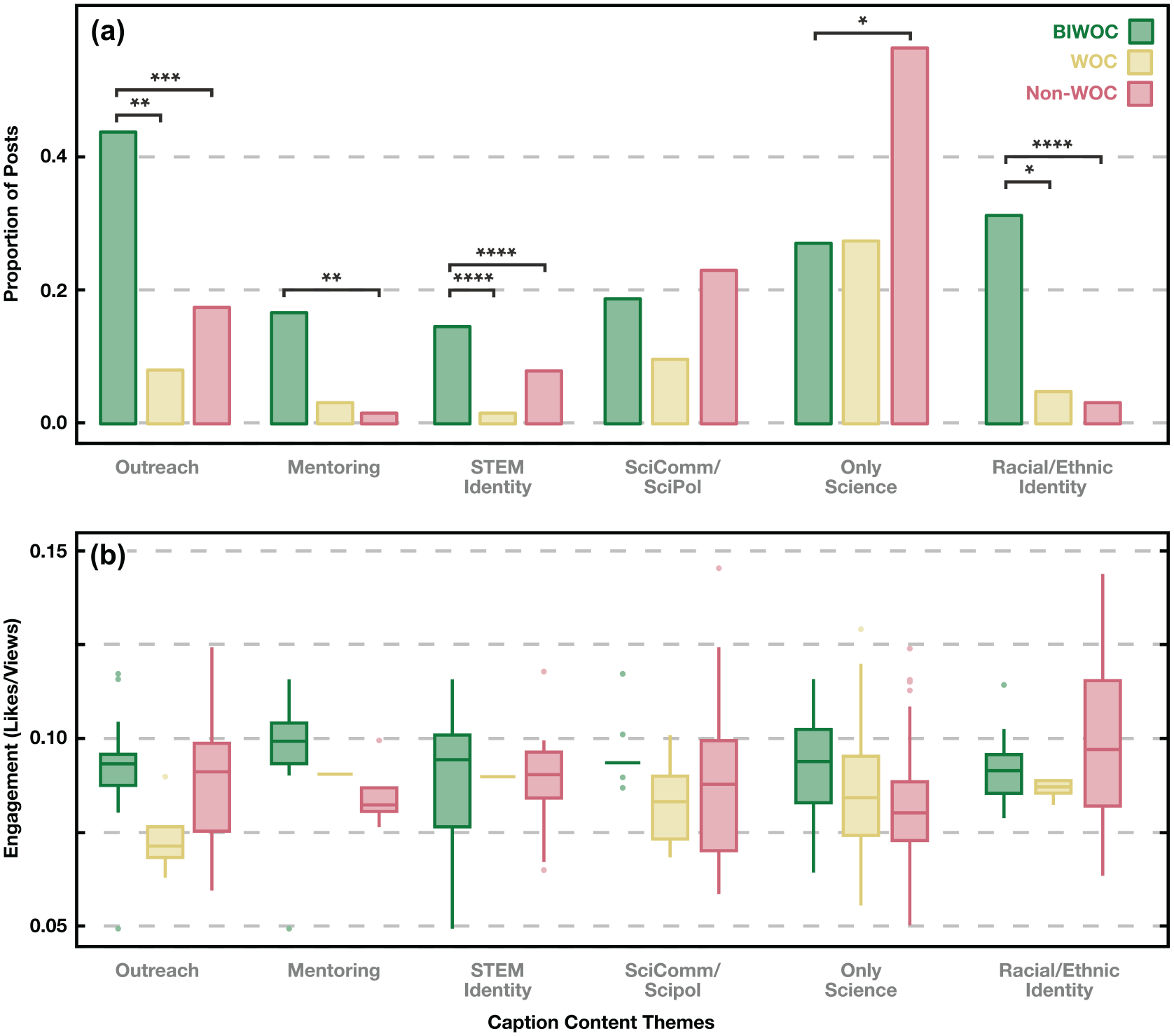 (a) Frequency and (b) engagement of Women Doing Science Instagram posts by aggregated caption themes. Proportions reflect the fraction of posts by scientists in each race, who included the respective theme in their post caption. A significantly higher proportion of BIWOC discussed themes of outreach, STEM identity, and racial/ethnic identity (compared with both non-WOC and WOC), and mentoring (compared with non- WOC). In contrast, a significantly higher proportion of non-WOC compared with BIWOC only discussed their science, as opposed to any additional aspects of their identity. In contrast, there were no differences in audience engagement across race or topic.