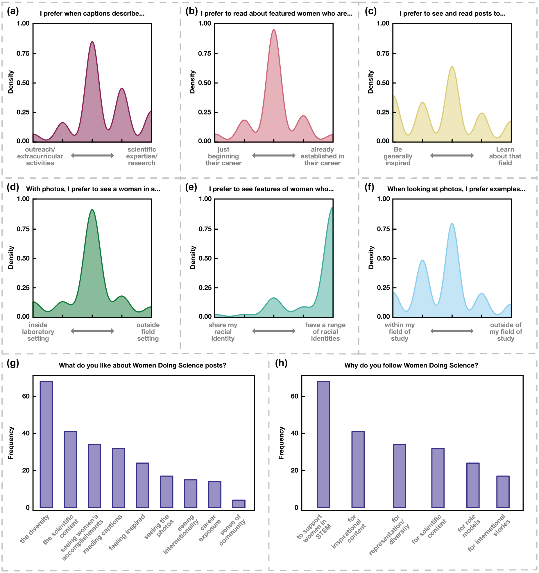 Results from the survey sent to Women Doing Science Instagram followers. Respondents were asked to rank their preference between two options for a series of questions about engaging with posts’ photos and captions (a to f). Participants indicated they were slightly more likely to prefer reading about scientific research over outreach (a), no preference between reading about established versus entry-level scientists (b), no preference between reading for general inspiration over field-specific knowledge (c), no preference between photos of women in the lab versus the field (d), significant preference over seeing women with a range of racial identities rather than sharing the participant’s racial identity (e), and slight preference so seeing photos from women in the participant’s field rather than outside of it (f). Prior to these specific rankings, participants were asked for free responses to (g) why they like Women Doing Science posts and (h) why they follow Women Doing Science. Responses were grouped by theme (identified using a topic modeling analysis) and ranked by frequency.