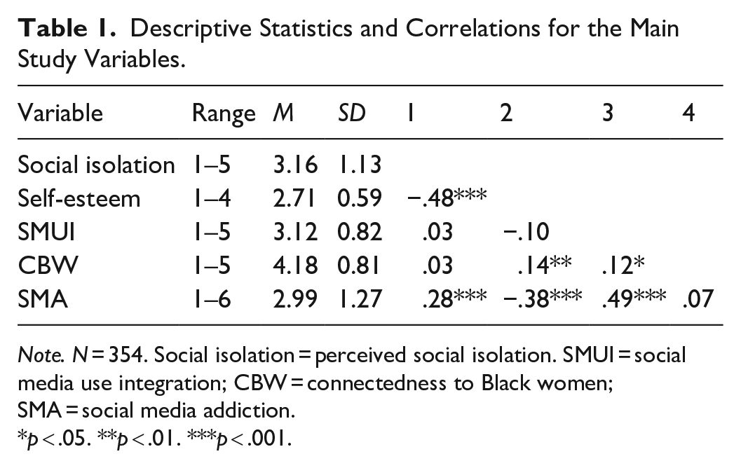 Prior meta-analyses have reported a negative correlation between self-esteem and Facebook addiction (Marino et al., 2018) and social media addiction (Huang, 2022). Scholars have speculated that low self-esteem may shape people’s preferences for online social interaction which allows for greater perceived control over one’s self-presentation (Lee & Cheung, 2014). In turn, preferences for online social interaction have been linked with greater risks for Internet addiction (Kim & Davis, 2009). While one study demonstrated a negative association between self-esteem and social media use among Black American women (Stanton et al., 2017), research has yet to examine self-esteem in relation to Black American women’s social media addiction. Despite these gaps in research with Black American women, we account for literature demonstrating the relations between perceived social isolation and self-esteem with social media addiction by controlling for these variables within our analyses.