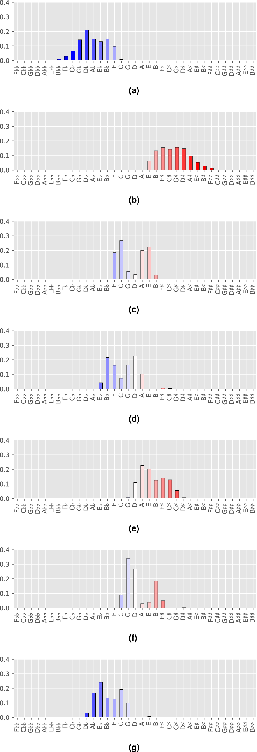 The inferred tonal pitch-class distributions for seven topics are shown in Figure 9. Note that the order of the topics has no particular meaning and that some weights for tonal pitch classes in the topics are too small to be displayed. The numerical values for the probabilities of the tonal pitch classes in the respective topics are given in Table 1.