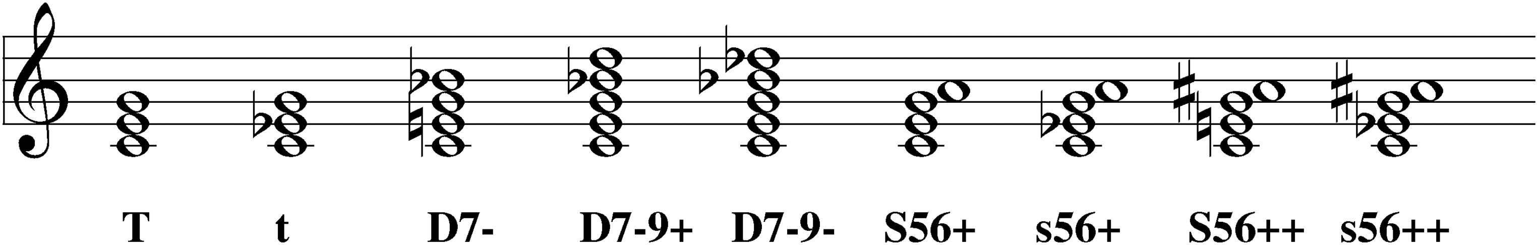 Functional chord symbols consist of two parts: a sequence of letters gives some pitch class as the root of the chord, relative to the currently valid tonic centre. The characters T, t, D, d, S and s stand for the chords of the three fundamental functions tonic, dominant and subdominant, with major or minor third, respectively.