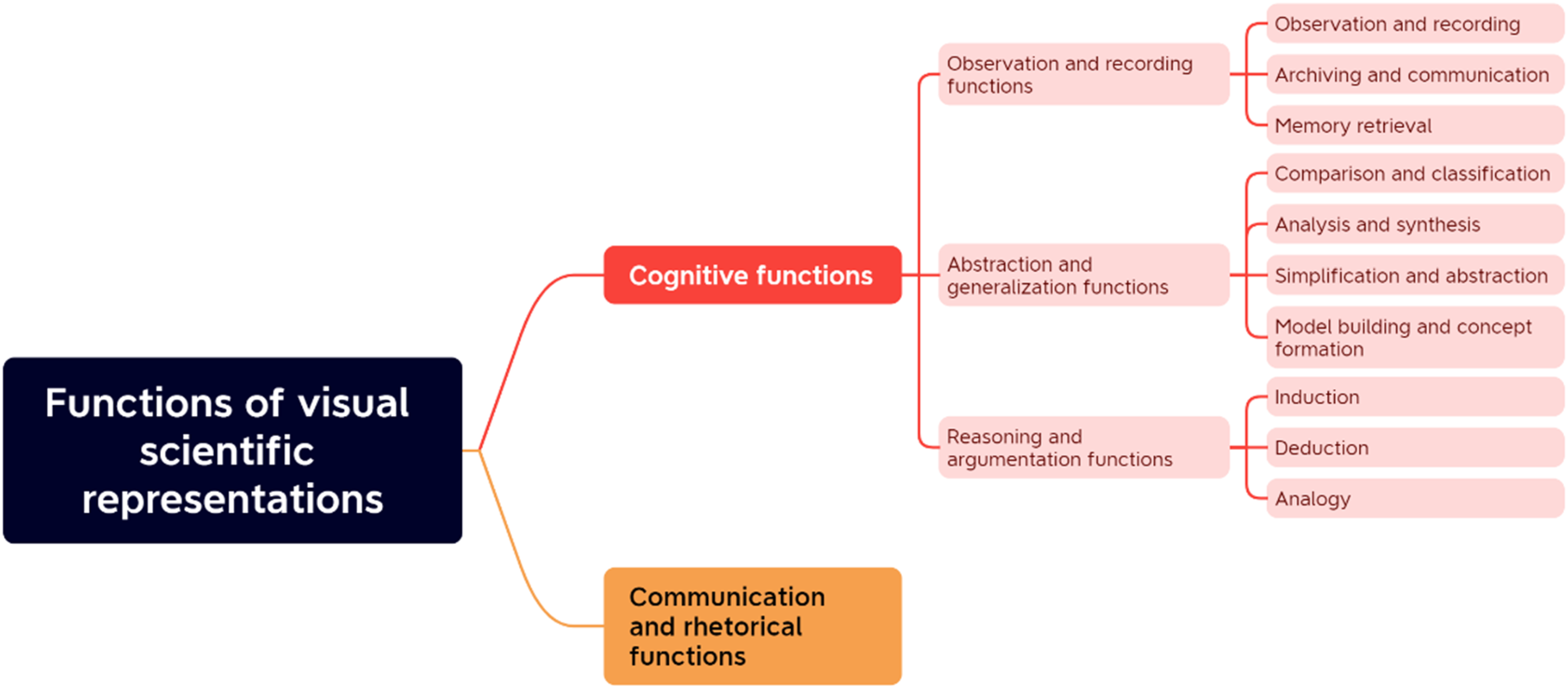 According to art and science historians, the cognitive functions of visual scientific representations include observation, recording, comparison, classification, abstraction, generalization and visual thinking. These functions align with dialectical materialist epistemology, which describes knowledge progression from perceptual to rational understanding. They also reflect child development psychology's insights into cognitive features across different ages and correspond with the stage goals outlined in the