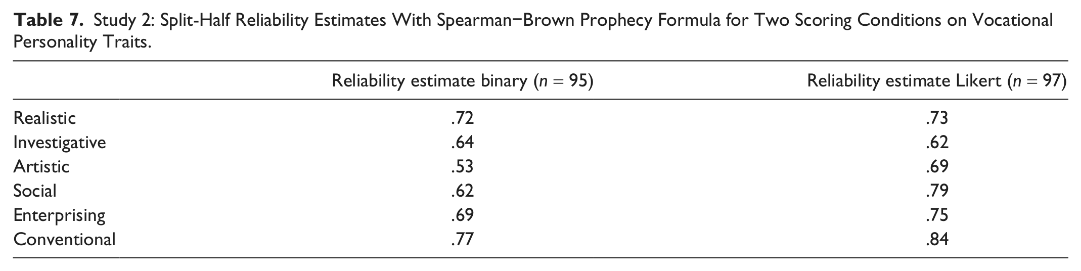 Simulation Study: Split-Half Reliability Estimates With Spearman–Brown Prophecy Formula for Scoring Conditions With Vocational Personality Traits.