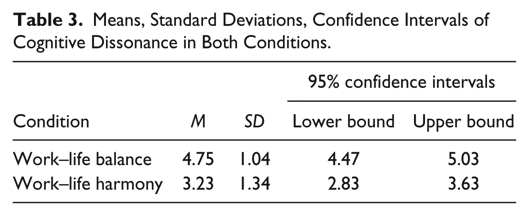 A one-way between-groups ANOVA was conducted to explore the differences in levels of cognitive dissonance between the work–life conditions. Participants were either assigned to the WLB (
